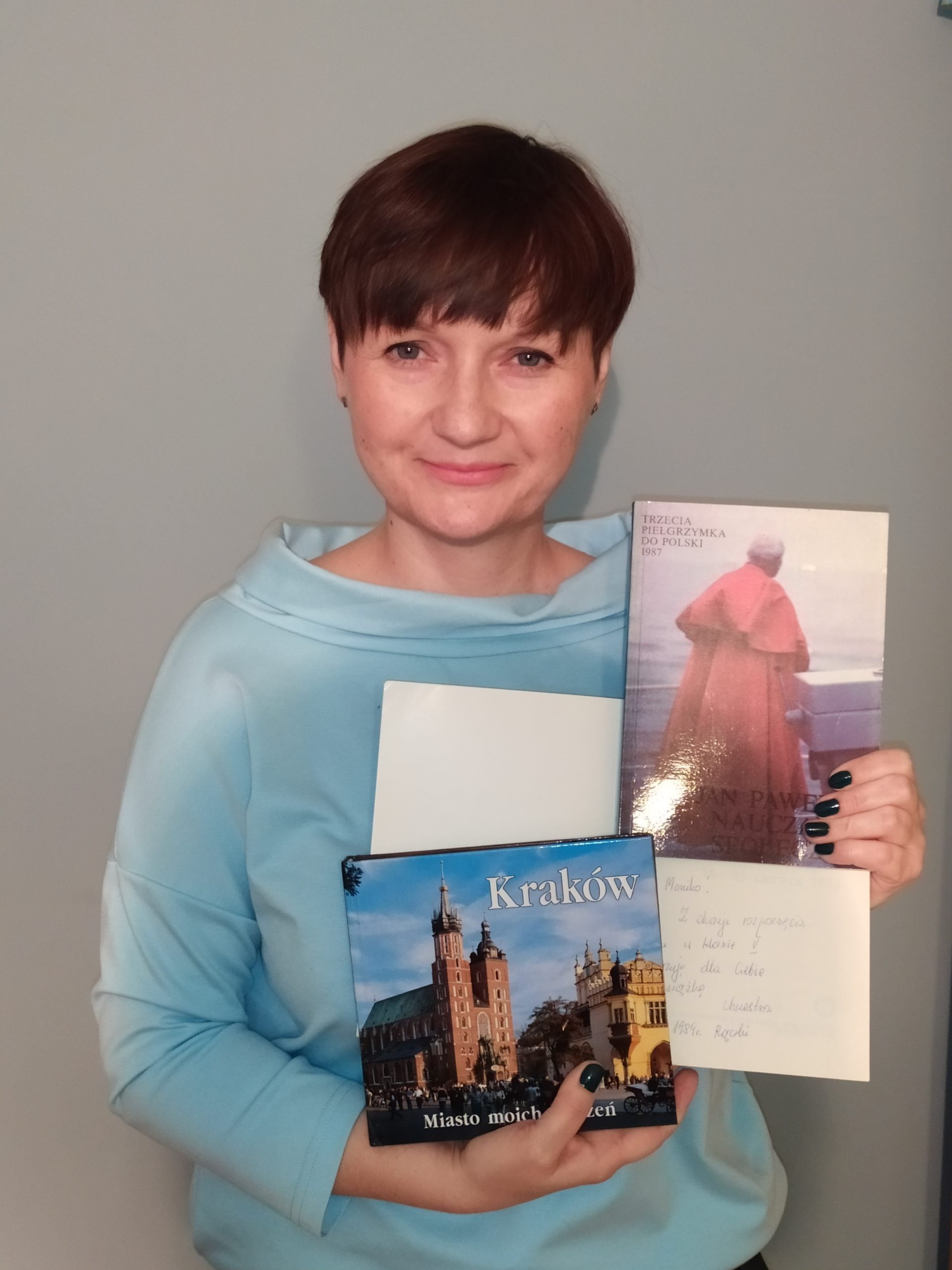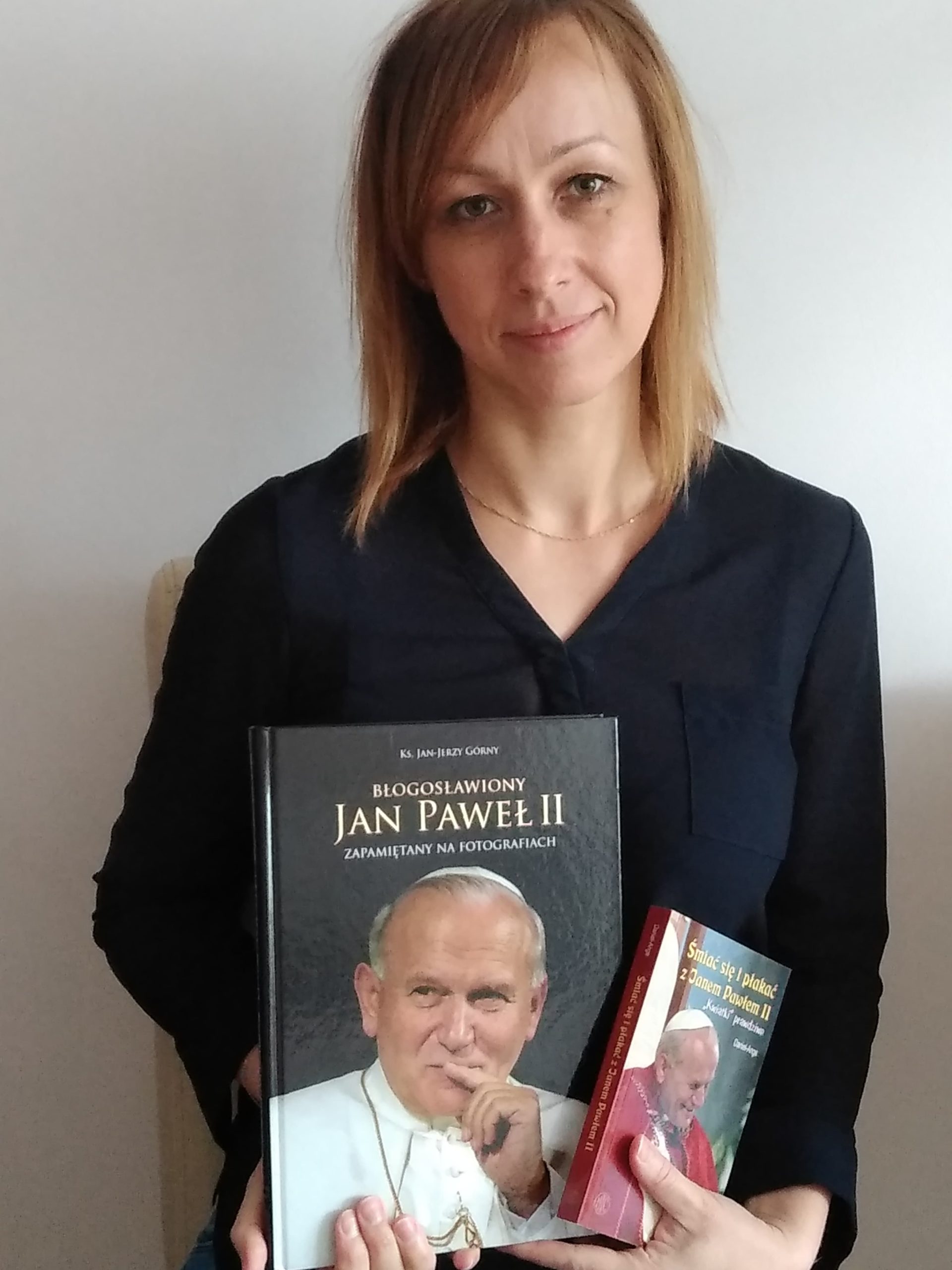 Mam dwie takie wyjątkowe pamiątki związane z Ojcem Świętym. Pierwsza to albumy z pielgrzymek Papieża do Polski w roku 1982 oraz w roku 1983. Mają one dla mnie wartość szczególną, ponieważ otrzymałam je od mojej chrzestnej z piękną dedykacją z okazji rozpoczęcia nauki w klasie piątej. Druga ma związek z moim ukochanym Krakowem, gdzie wówczas studiowałam i wspomnieniem wspaniałej atmosfery mszy św. na Błoniach