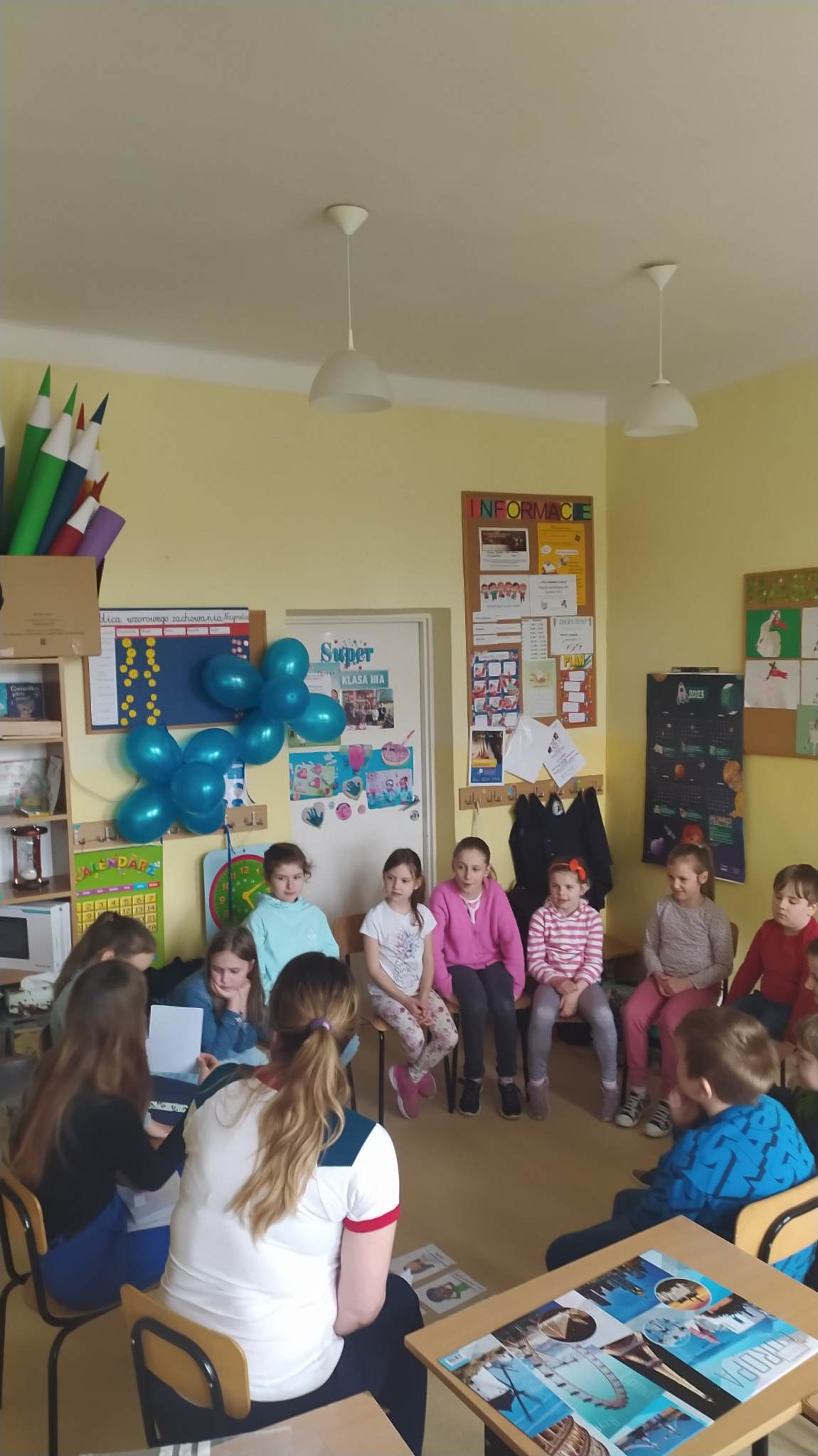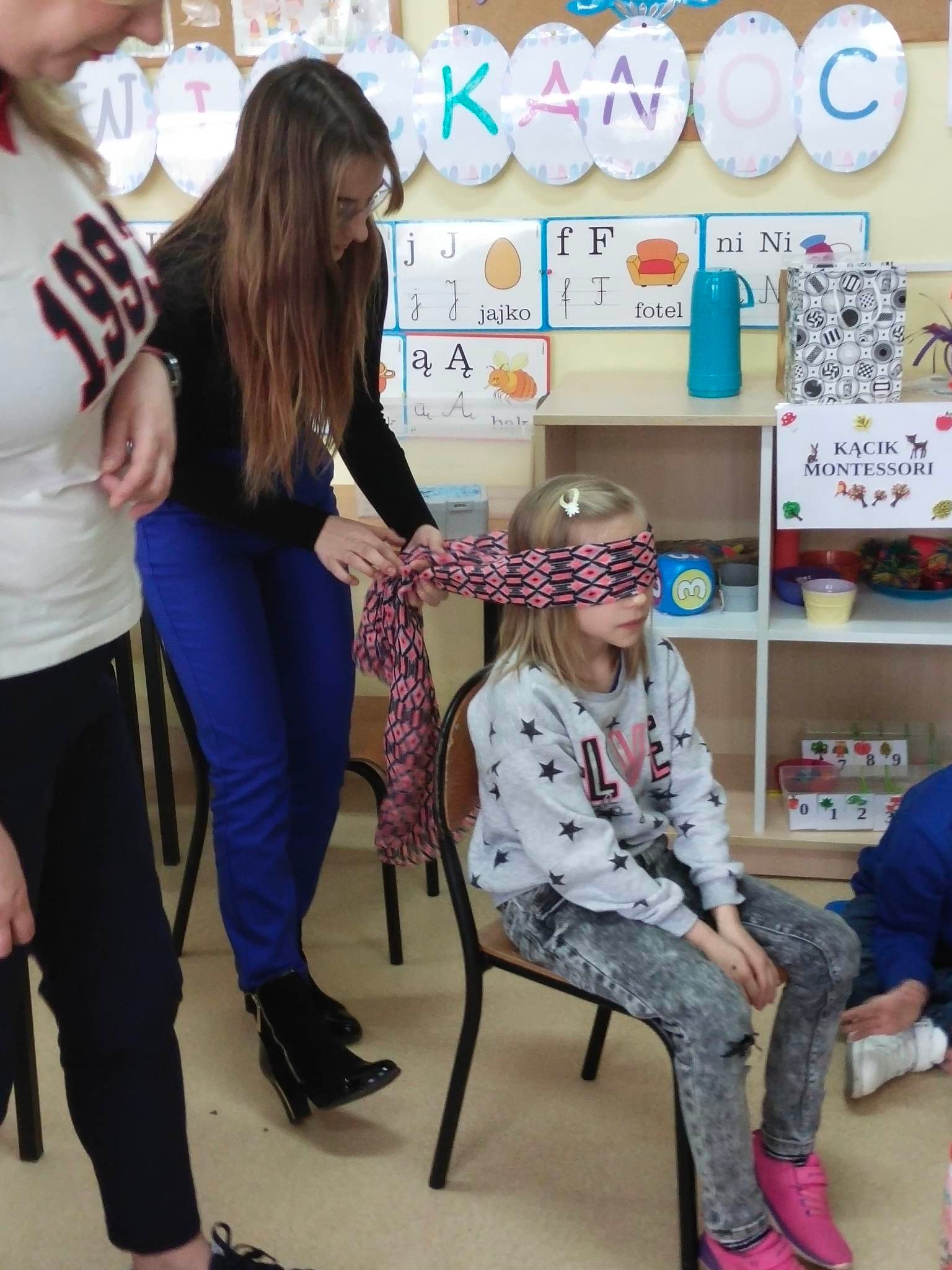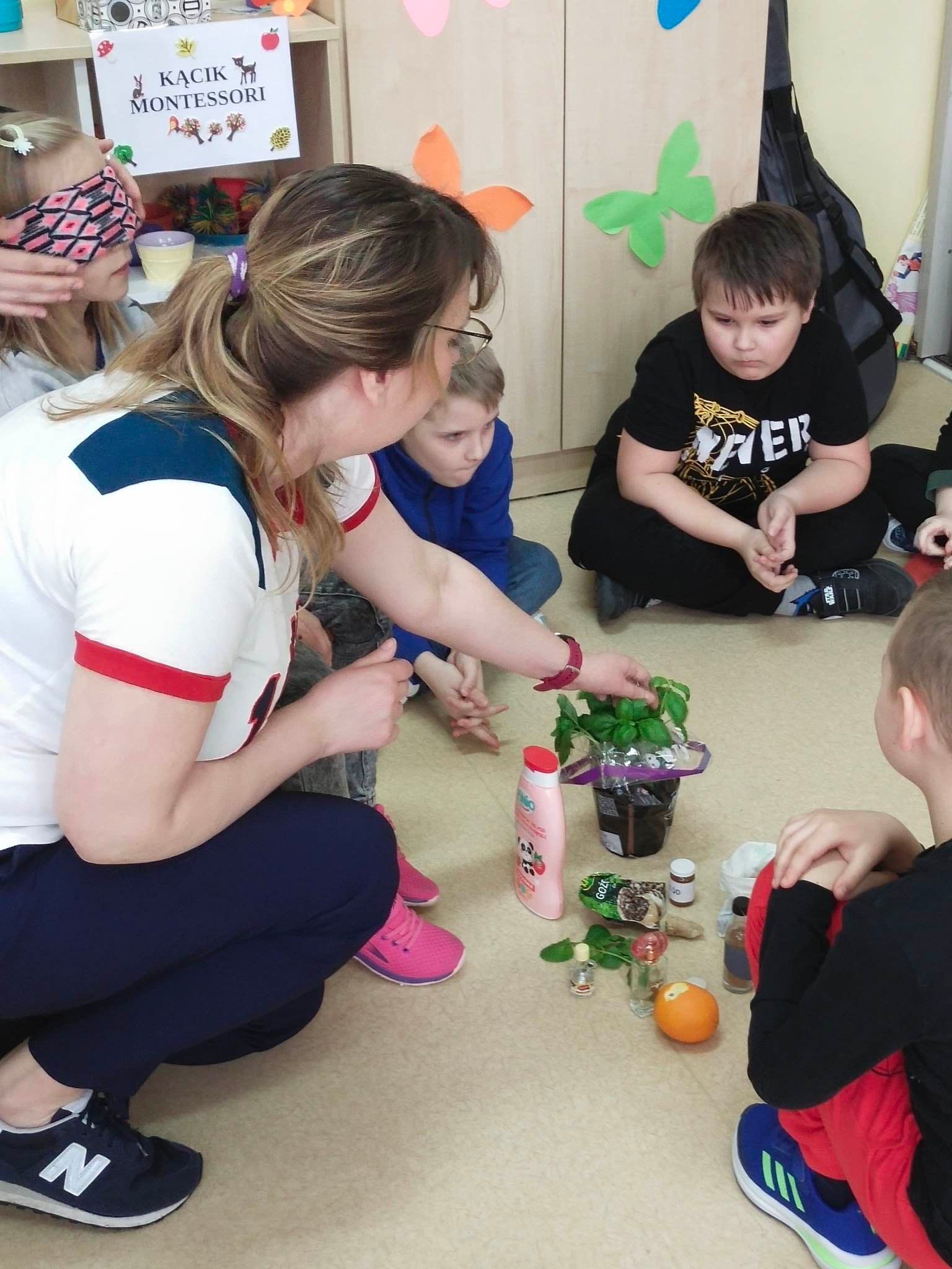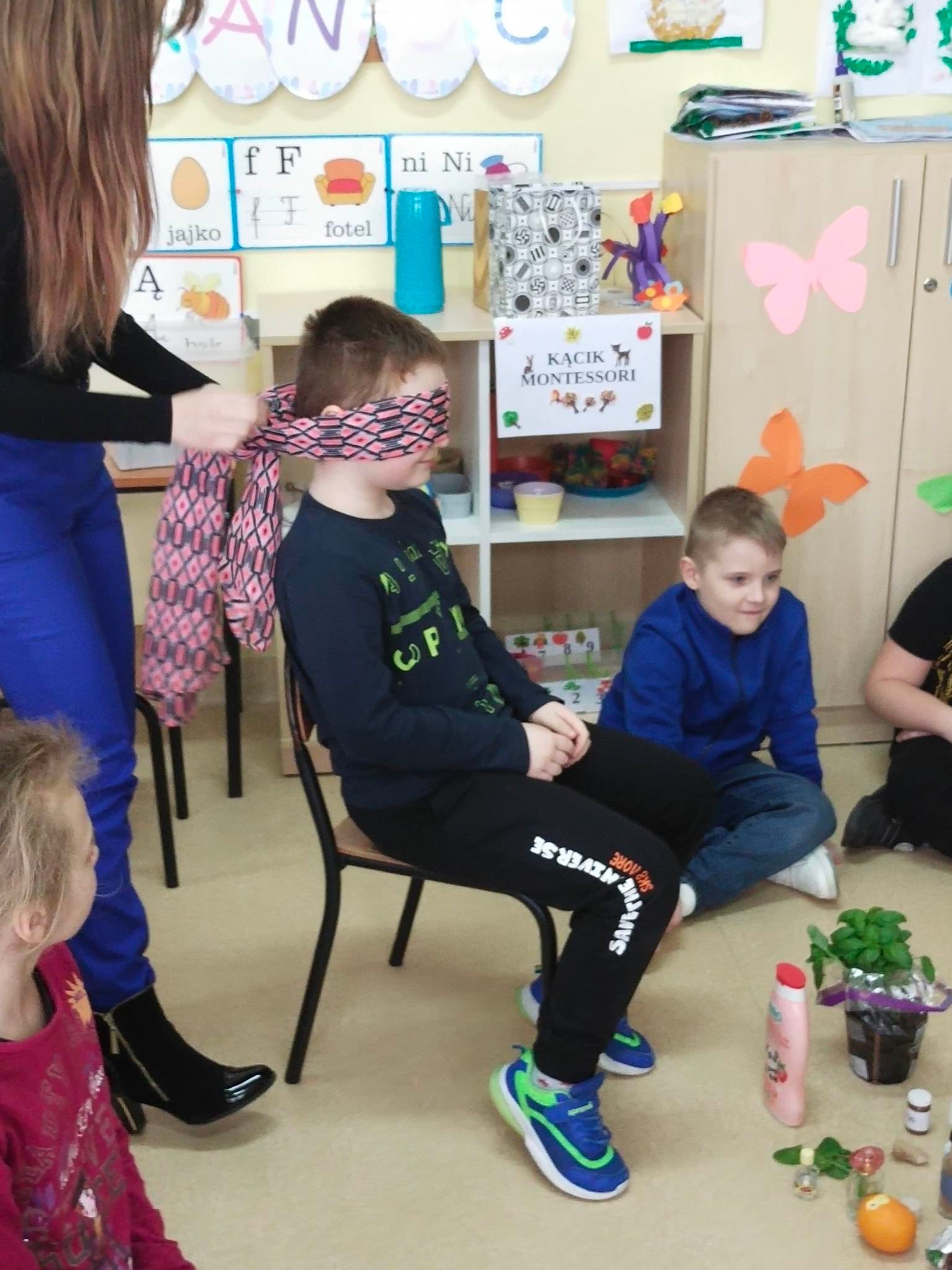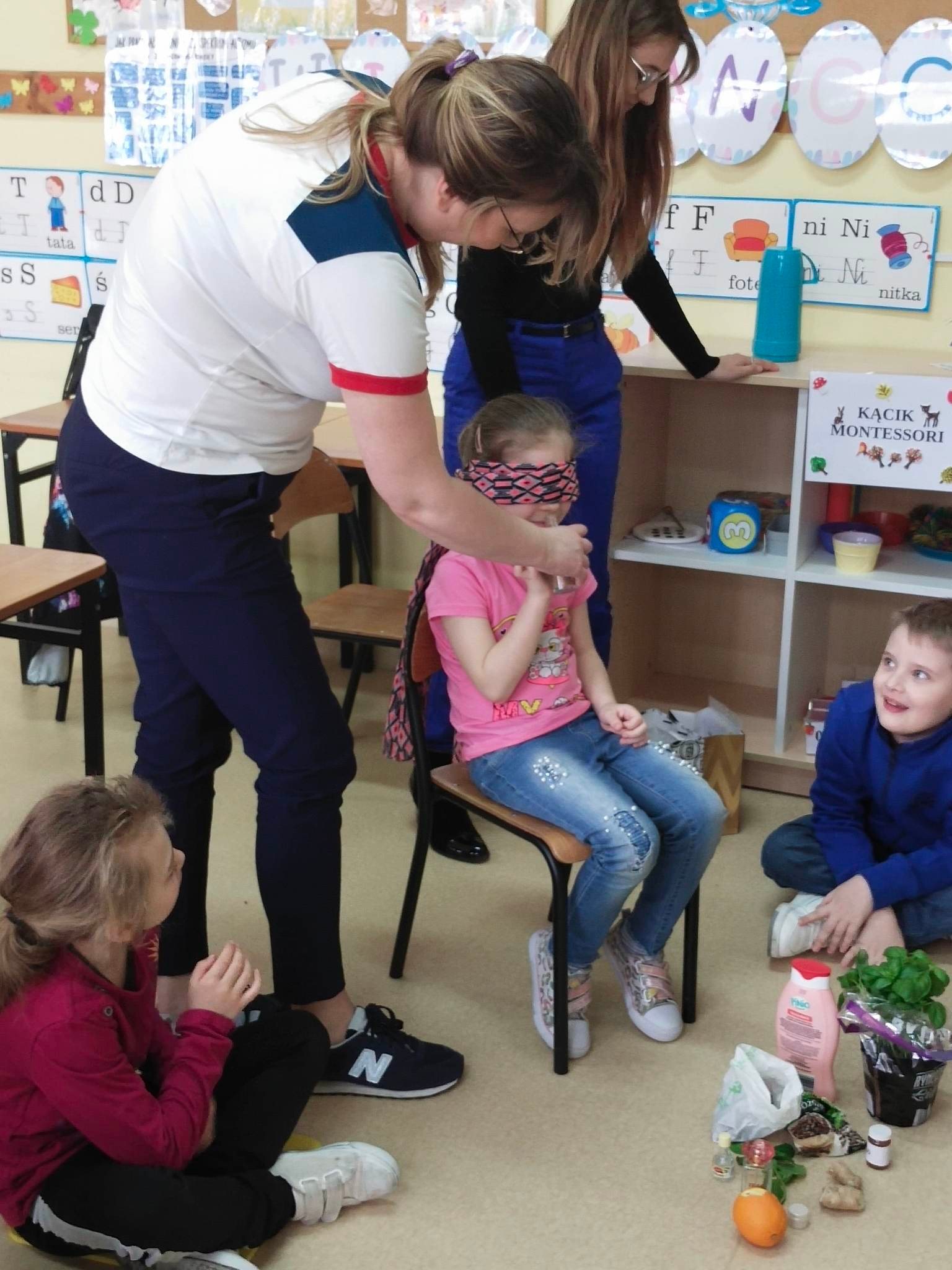 Zapoznały się z naturalnymi zapachami z otaczającego ich świata ( czekolady, mięty, mydła, cynamonu, perfum, kawy itp. ). Podczas rozmowy zastanawiały się czy zapachy im odpowiadają, z czym im się ko jarzą. Na koniec zajęć chętni uczniowie mieli możliwość zgadywać zapachy z zasłoniętymi oczami.