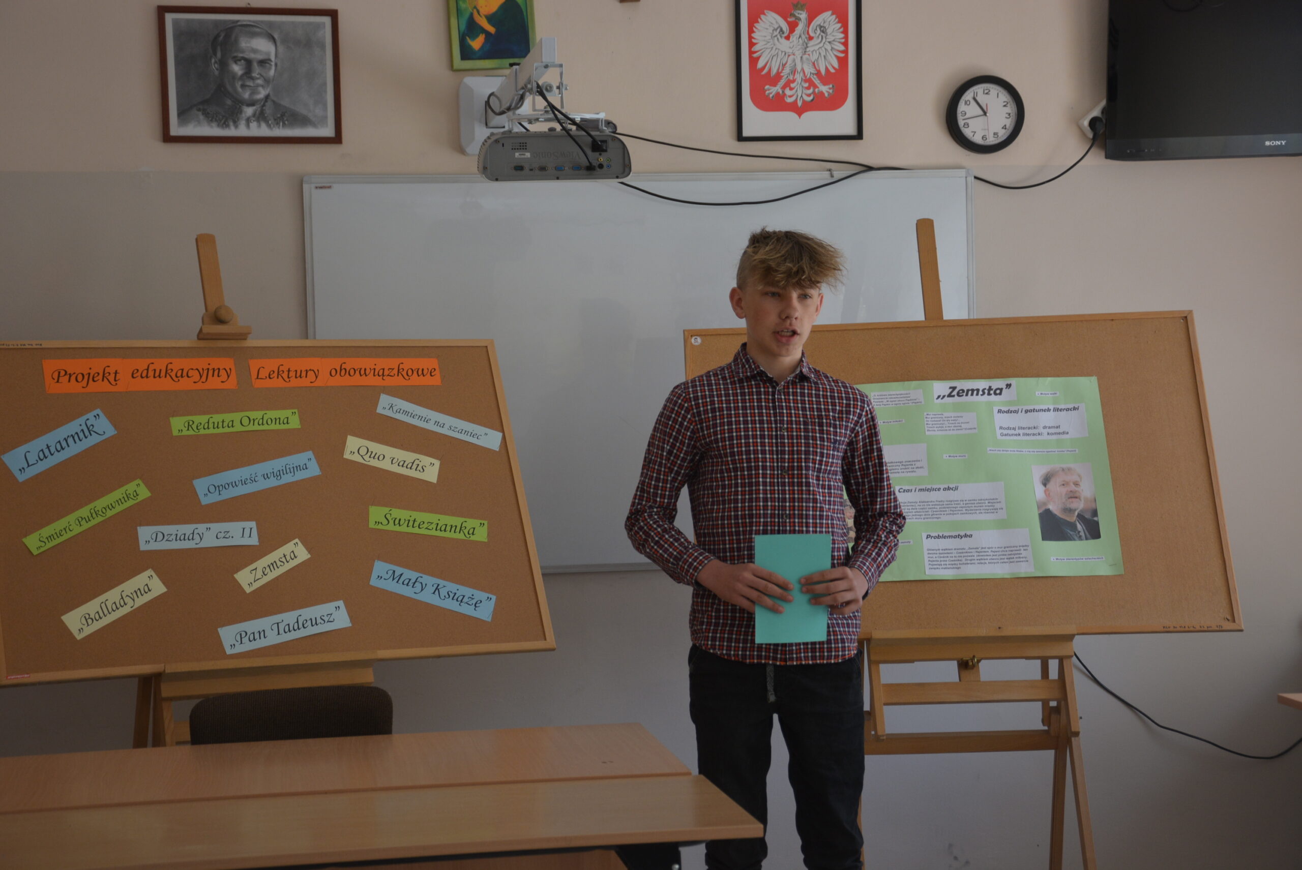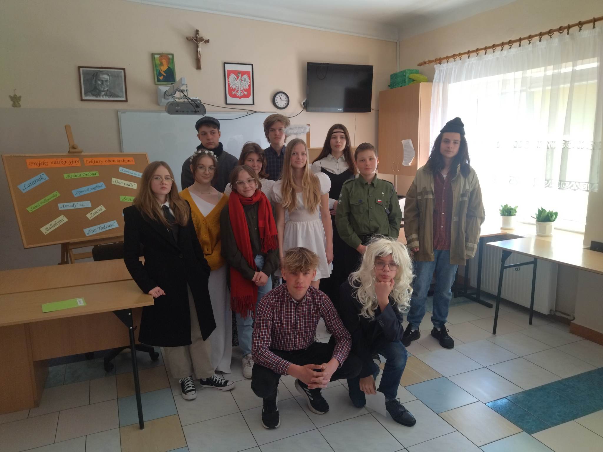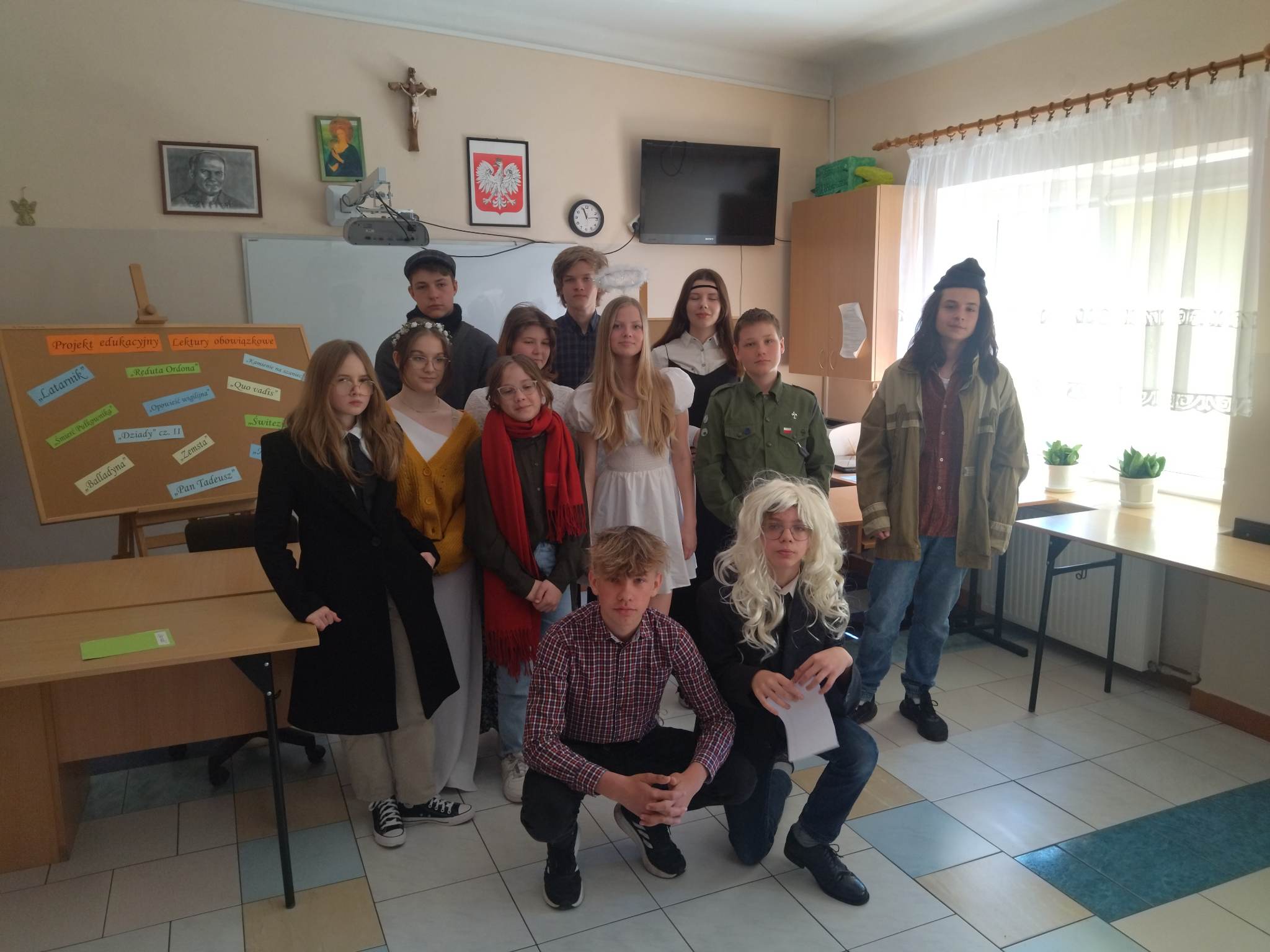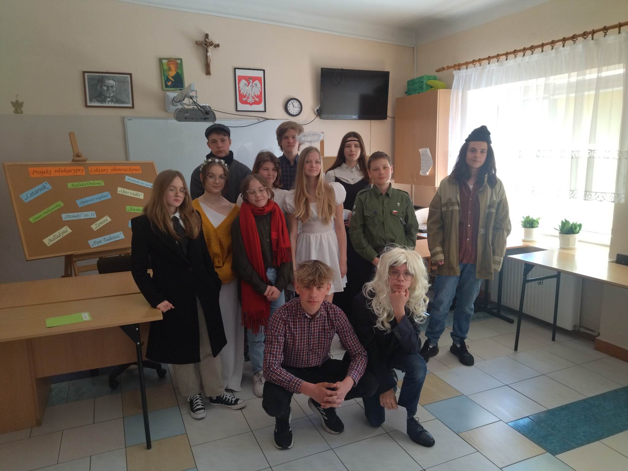 W ramach przygotowania do egzaminu ósmoklasisty uczniowie klasy ósmej zrealizowali w II semestrze projekt edukacyjny: „Lektury obowiązkowe”. W każdym tygodniu jeden z uczniów przypominał najważniejsze informacje dotyczące jednej z lektur, następnie wszyscy redagowali formy wypowiedzi, rozwiązywali krzyżówki, testy i wykonywali szereg innych zadań utrwalających wiedzę i doskonalących praktyczne umiejętności. Dzisiaj, na zakończenie projektu każdy z uczniów wcielił się w jednego z bohaterów.