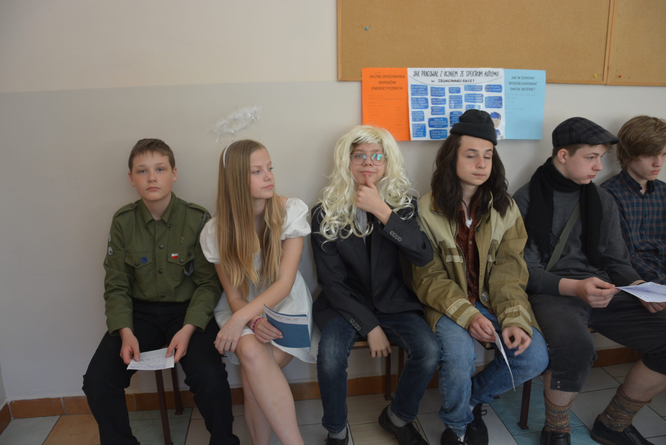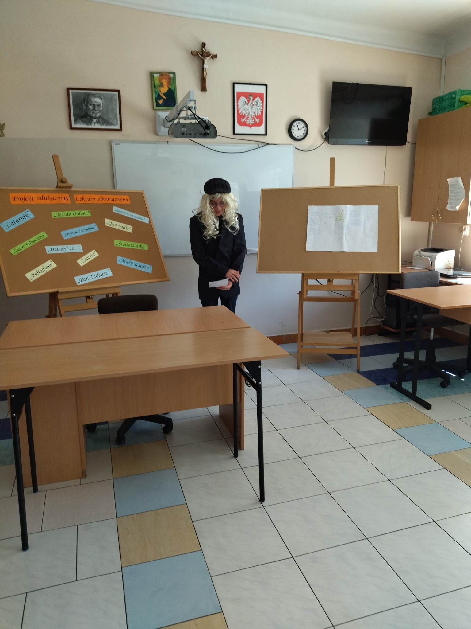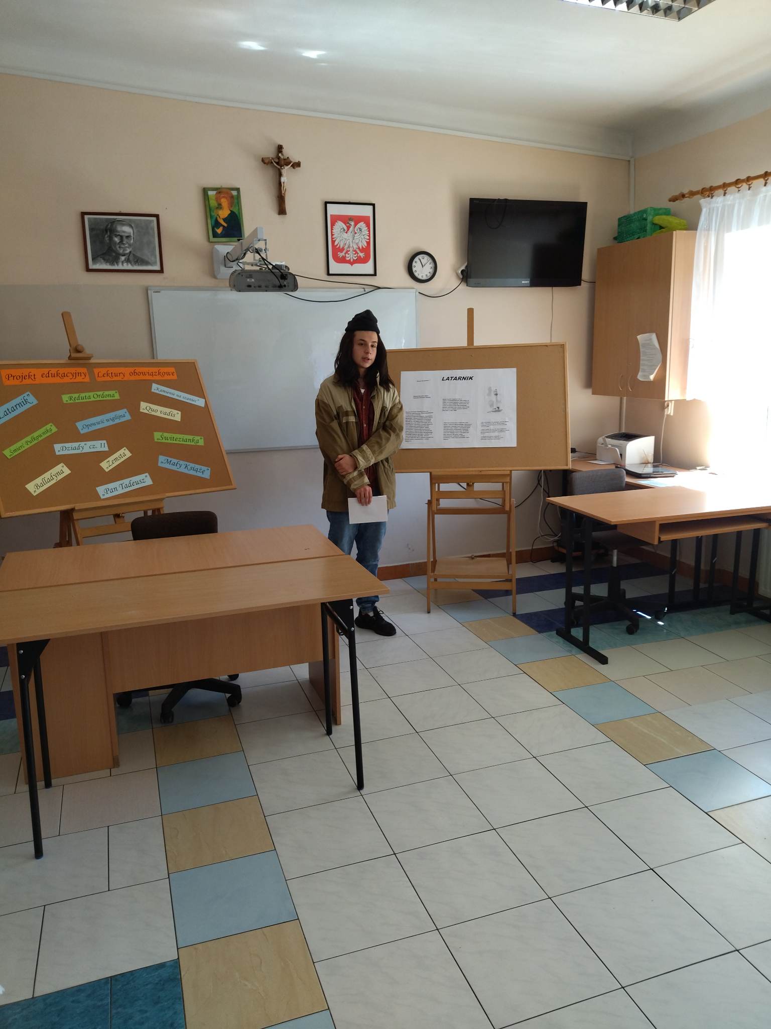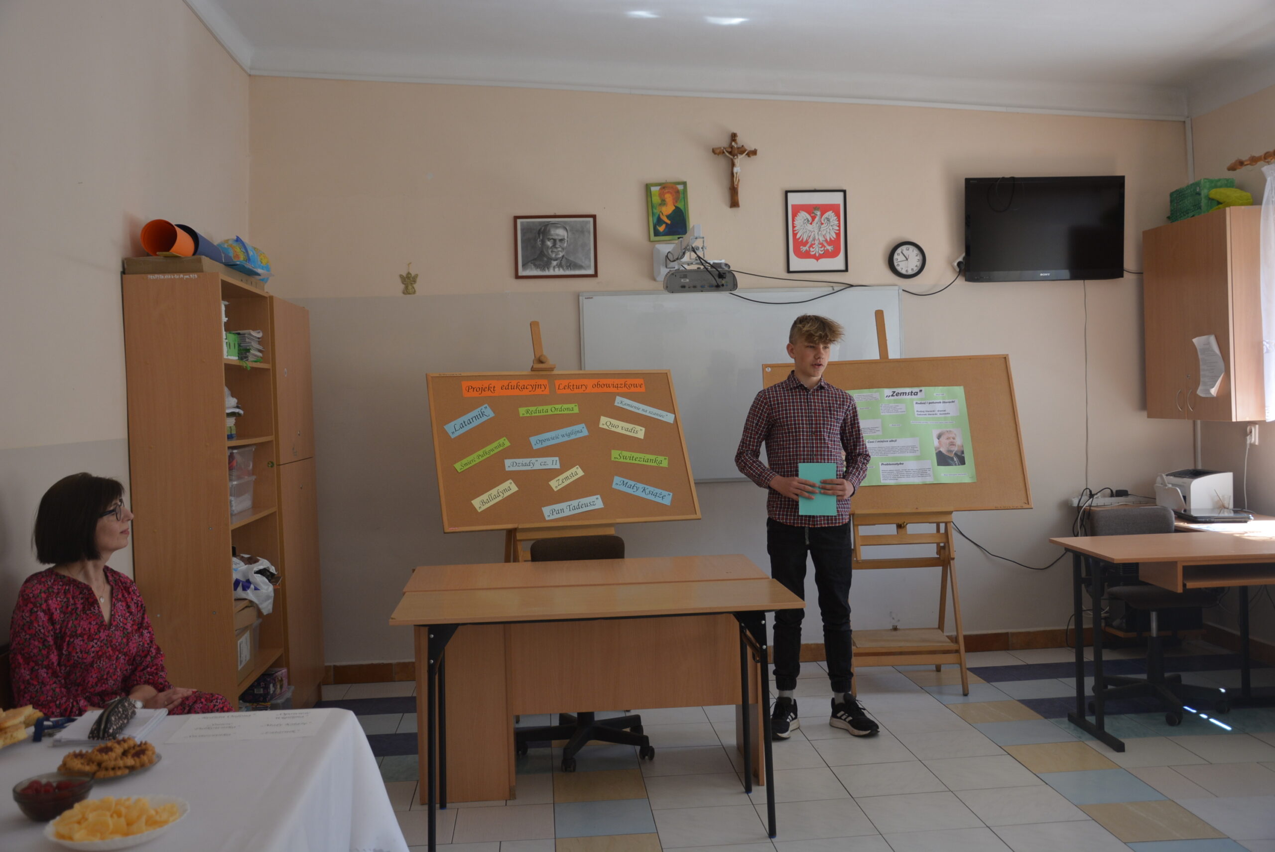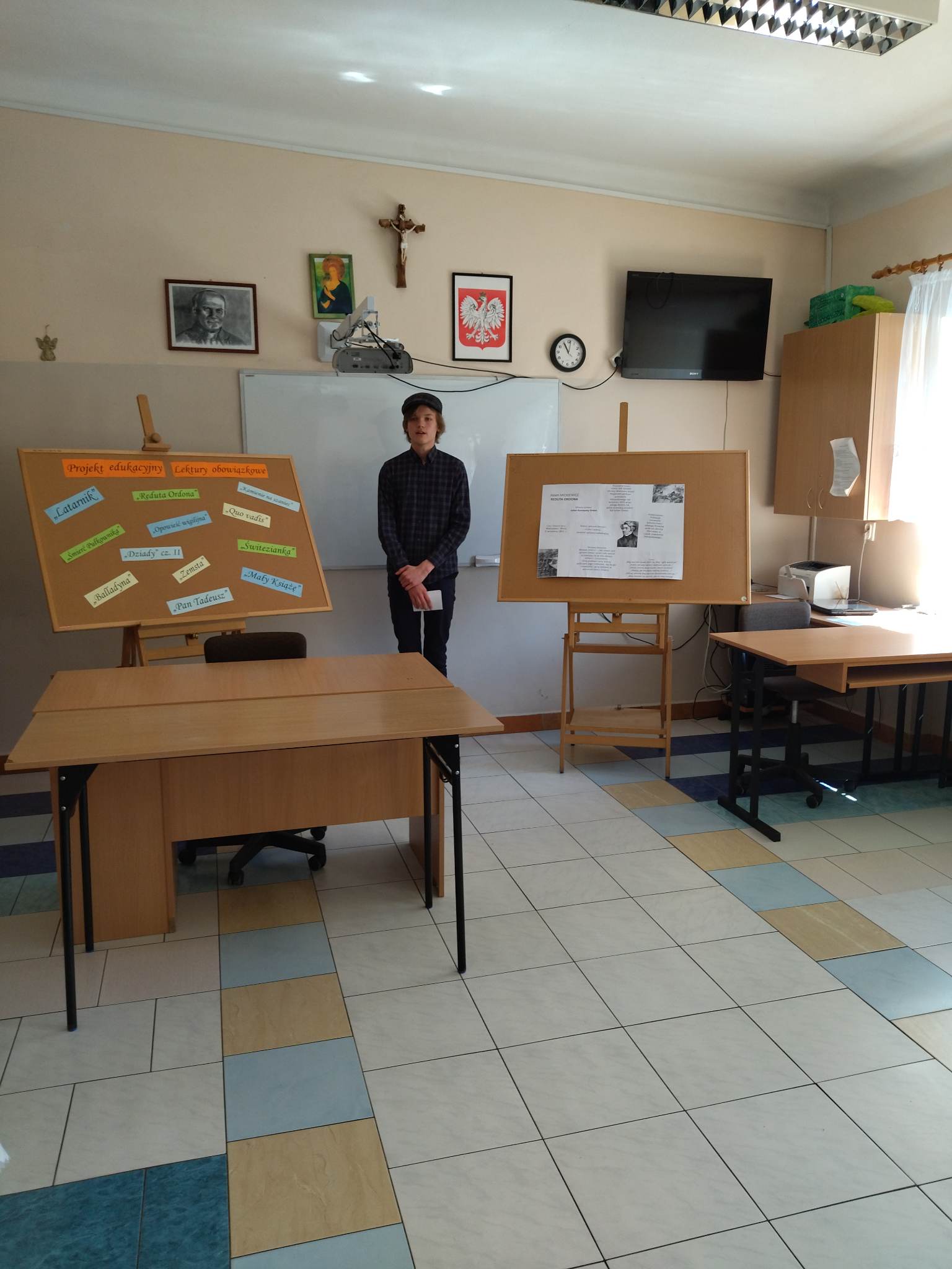 W ramach przygotowania do egzaminu ósmoklasisty uczniowie klasy ósmej zrealizowali w II semestrze projekt edukacyjny: „Lektury obowiązkowe”. W każdym tygodniu jeden z uczniów przypominał najważniejsze informacje dotyczące jednej z lektur, następnie wszyscy redagowali formy wypowiedzi, rozwiązywali krzyżówki, testy i wykonywali szereg innych zadań utrwalających wiedzę i doskonalących praktyczne umiejętności. Dzisiaj, na zakończenie projektu każdy z uczniów wcielił się w jednego z bohaterów.