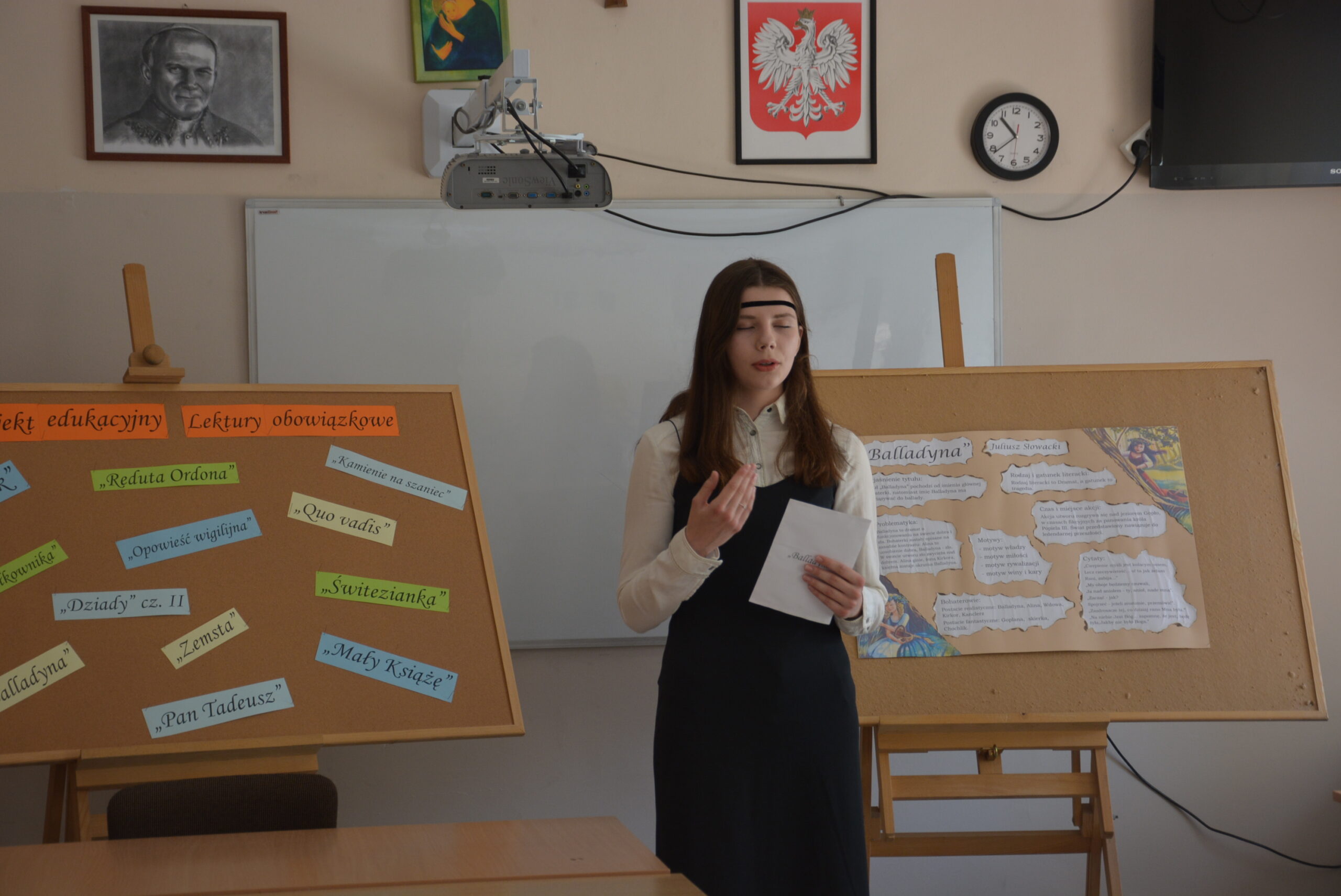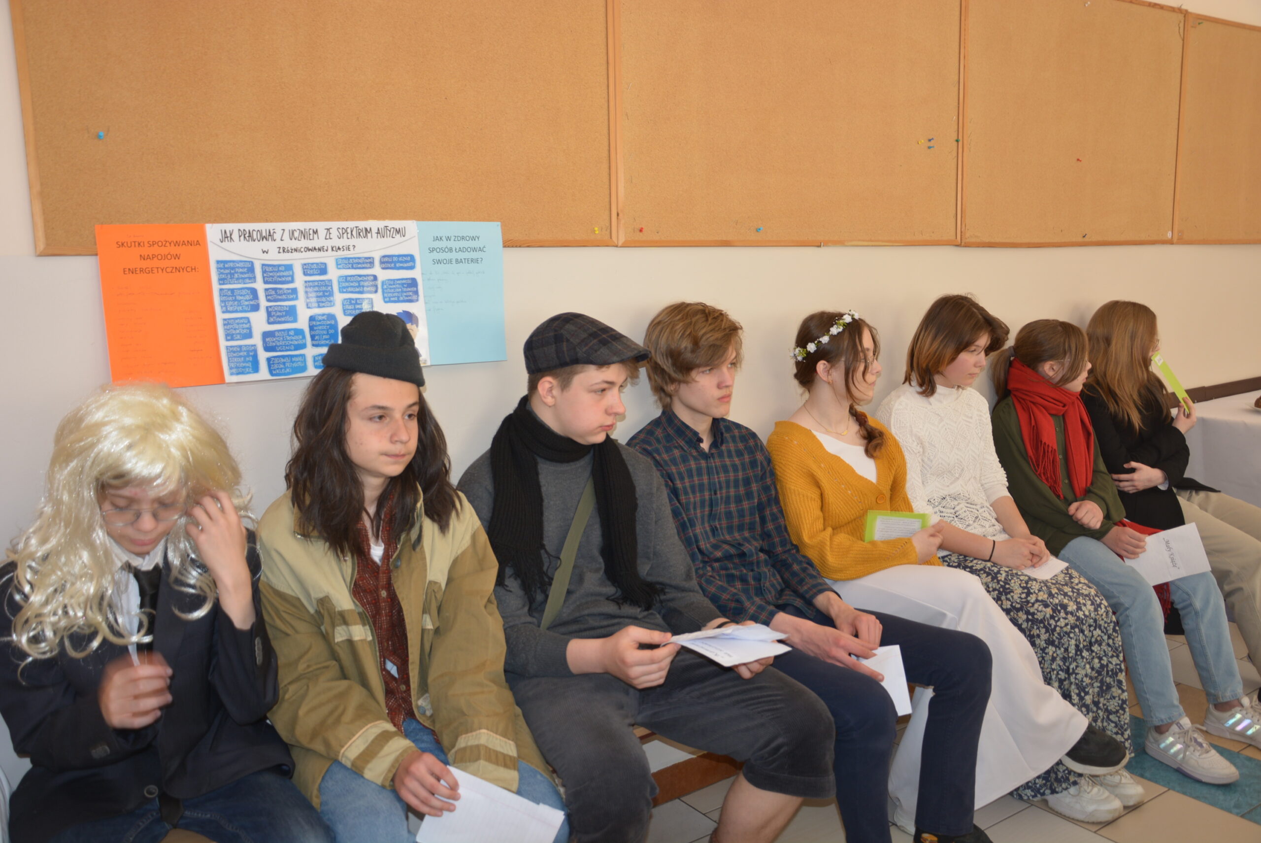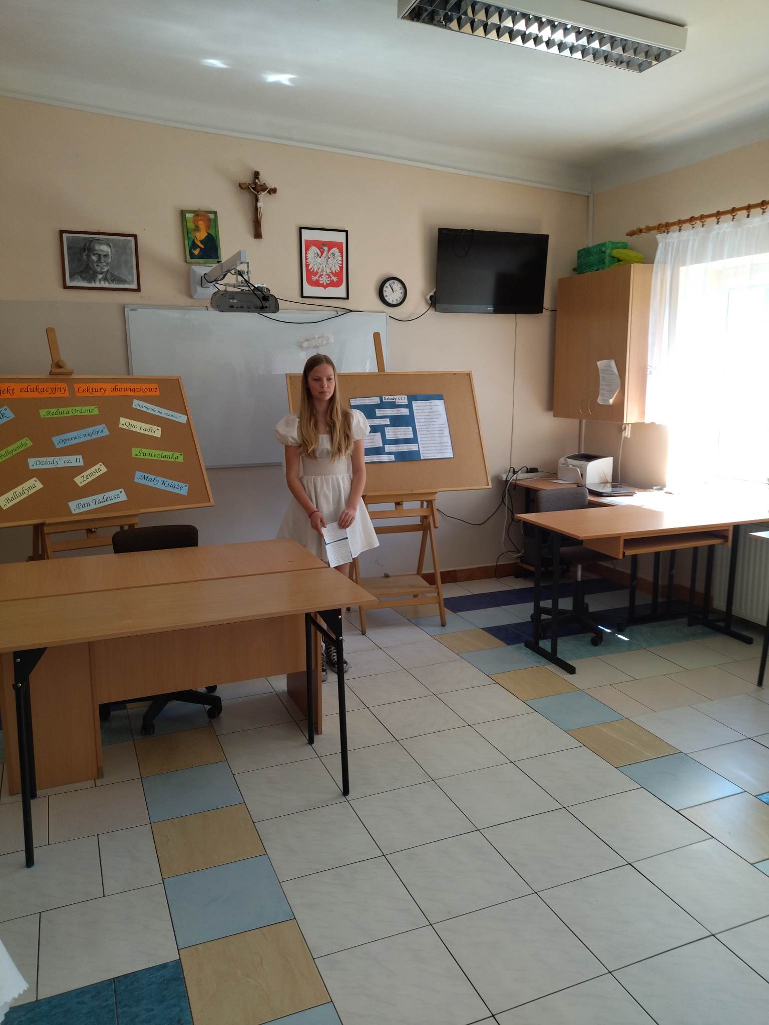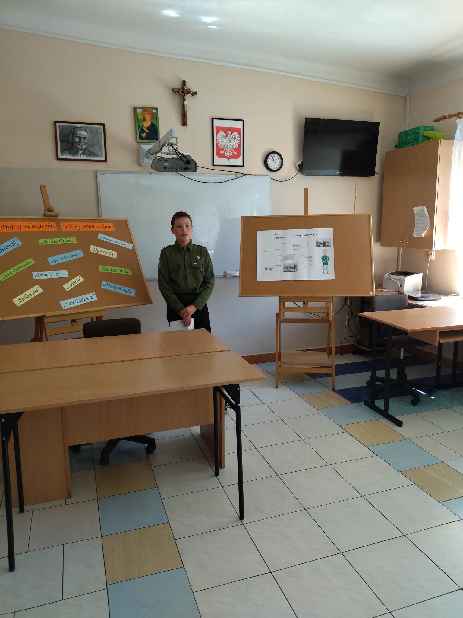 W ramach przygotowania do egzaminu ósmoklasisty uczniowie klasy ósmej zrealizowali w II semestrze projekt edukacyjny: „Lektury obowiązkowe”. W każdym tygodniu jeden z uczniów przypominał najważniejsze informacje dotyczące jednej z lektur, następnie wszyscy redagowali formy wypowiedzi, rozwiązywali krzyżówki, testy i wykonywali szereg innych zadań utrwalających wiedzę i doskonalących praktyczne umiejętności. Dzisiaj, na zakończenie projektu każdy z uczniów wcielił się w jednego z bohaterów.