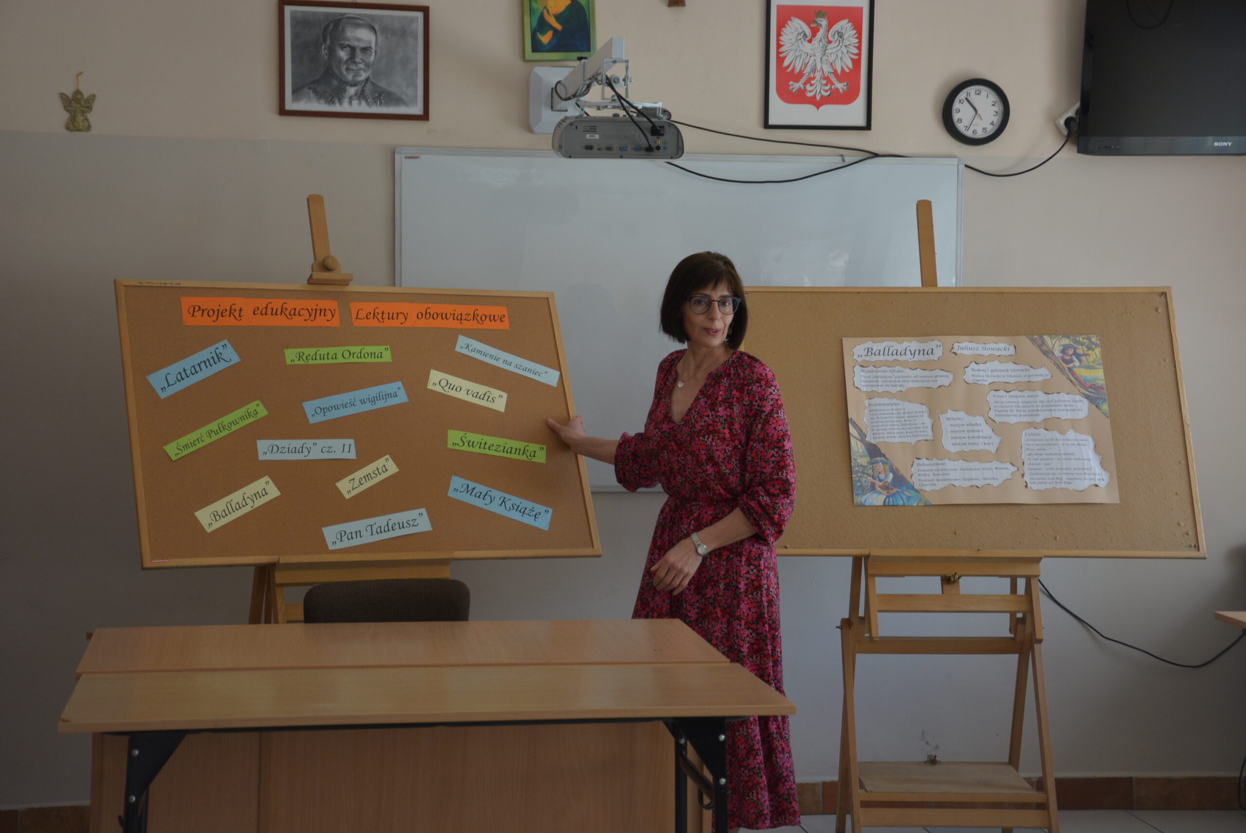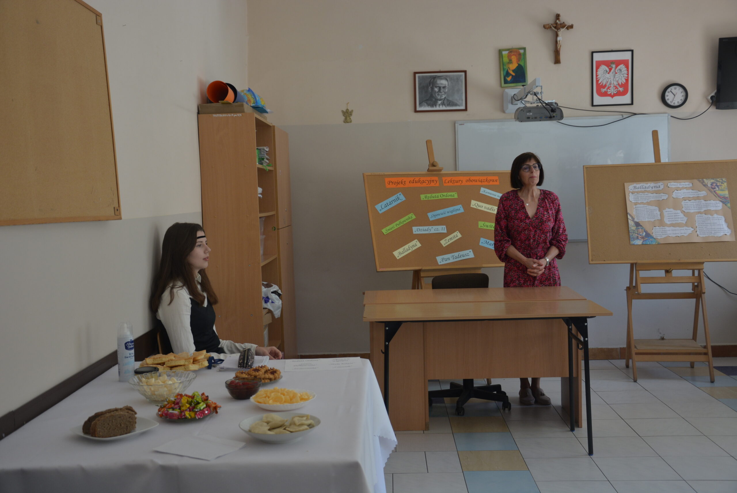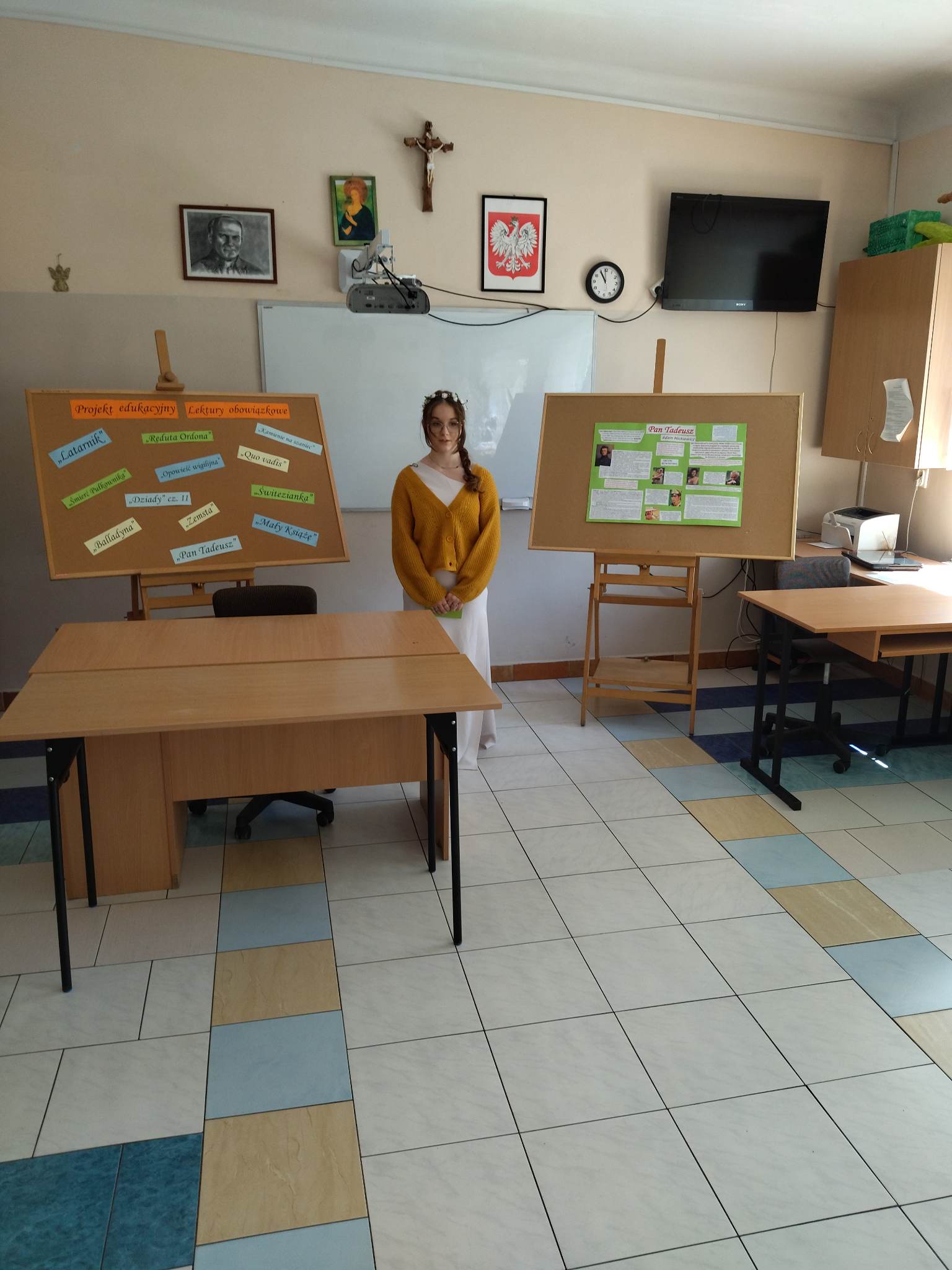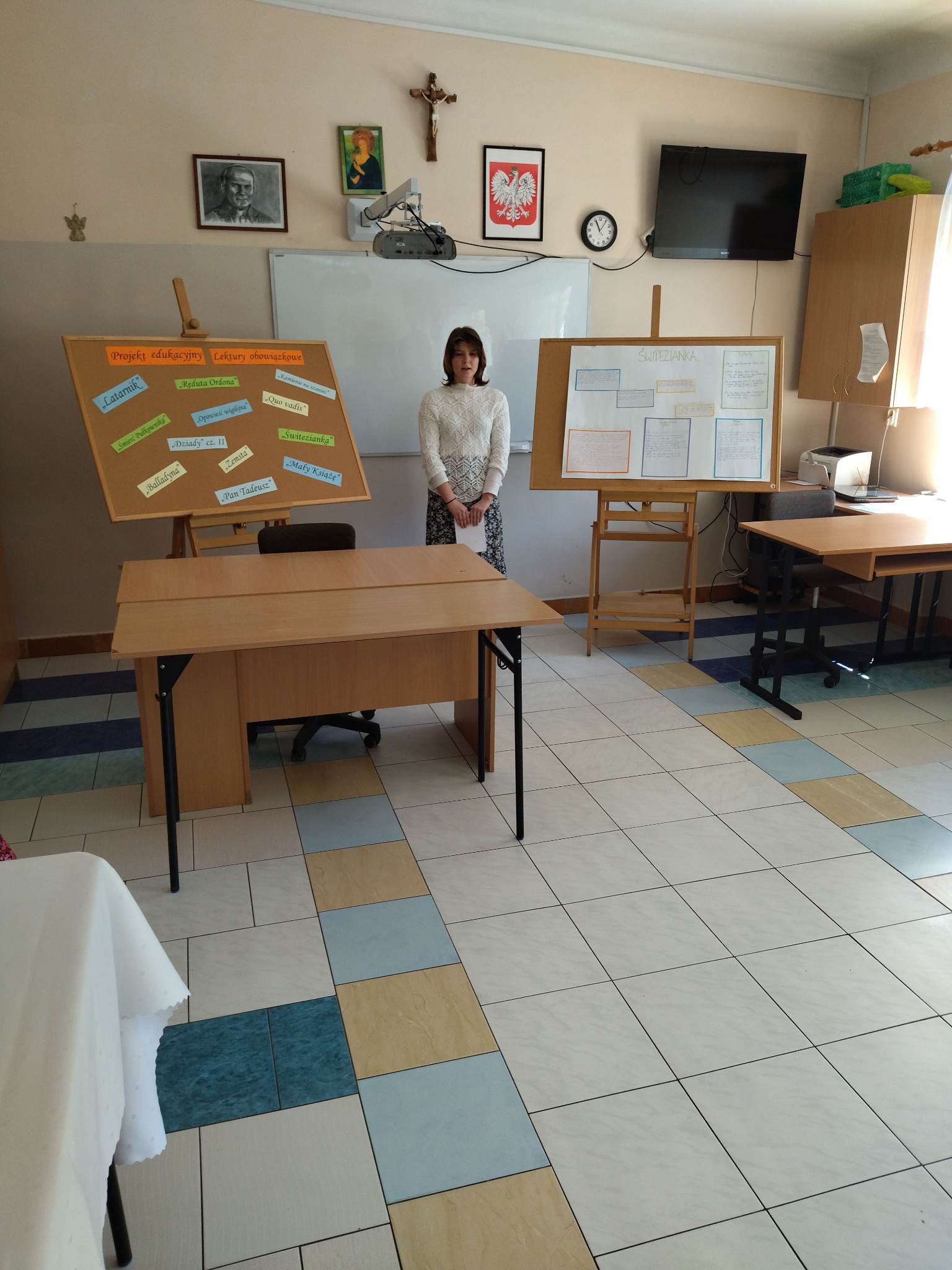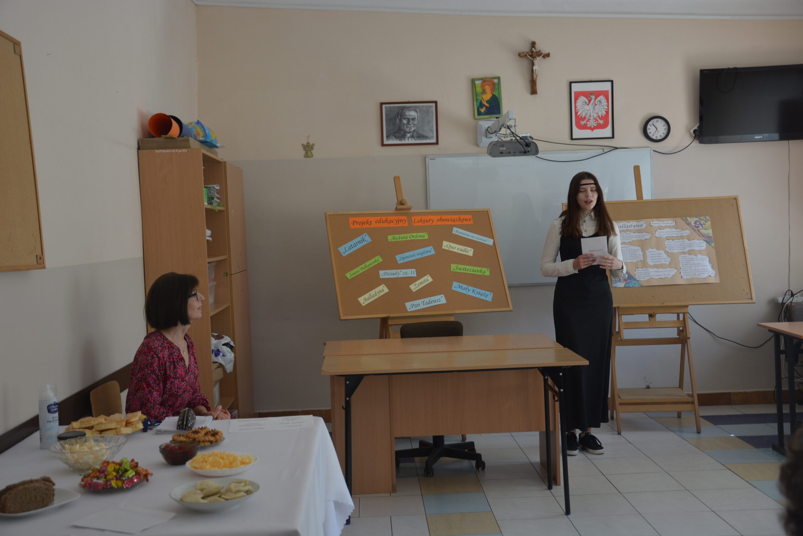 W ramach przygotowania do egzaminu ósmoklasisty uczniowie klasy ósmej zrealizowali w II semestrze projekt edukacyjny: „Lektury obowiązkowe”. W każdym tygodniu jeden z uczniów przypominał najważniejsze informacje dotyczące jednej z lektur, następnie wszyscy redagowali formy wypowiedzi, rozwiązywali krzyżówki, testy i wykonywali szereg innych zadań utrwalających wiedzę i doskonalących praktyczne umiejętności. Dzisiaj, na zakończenie projektu każdy z uczniów wcielił się w jednego z bohaterów.