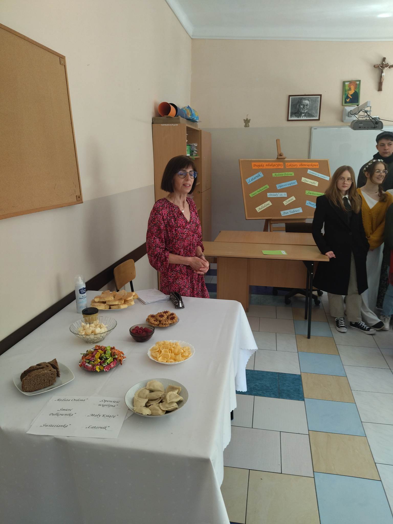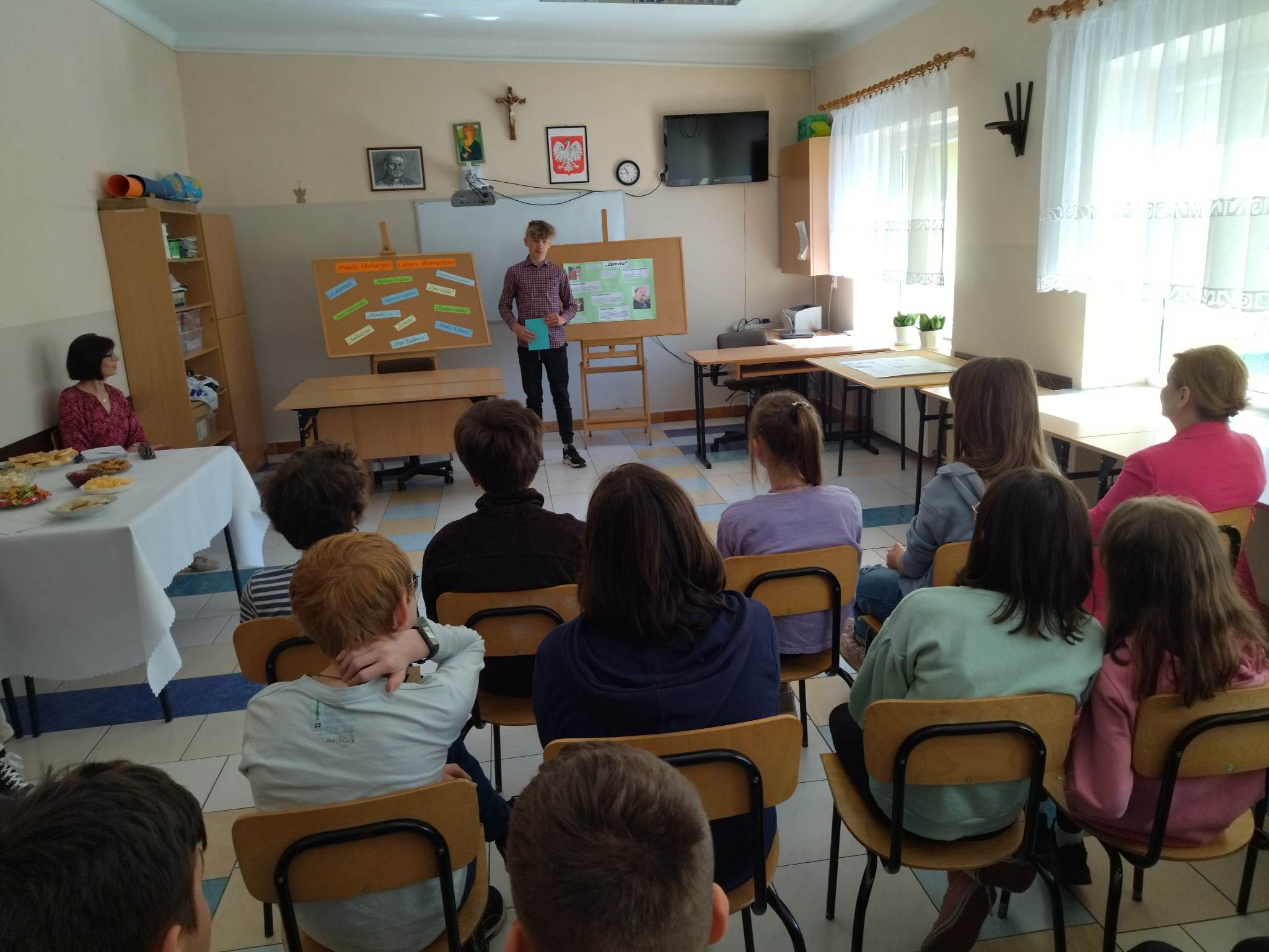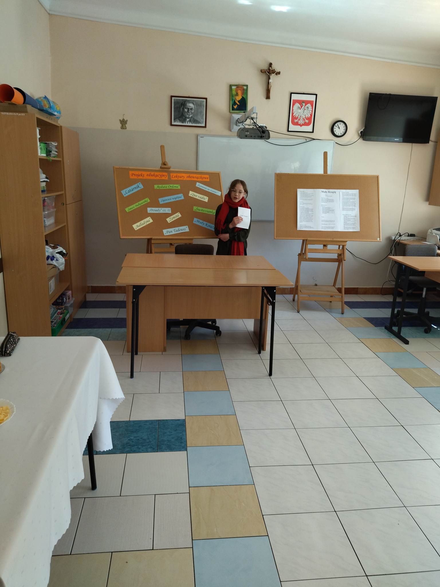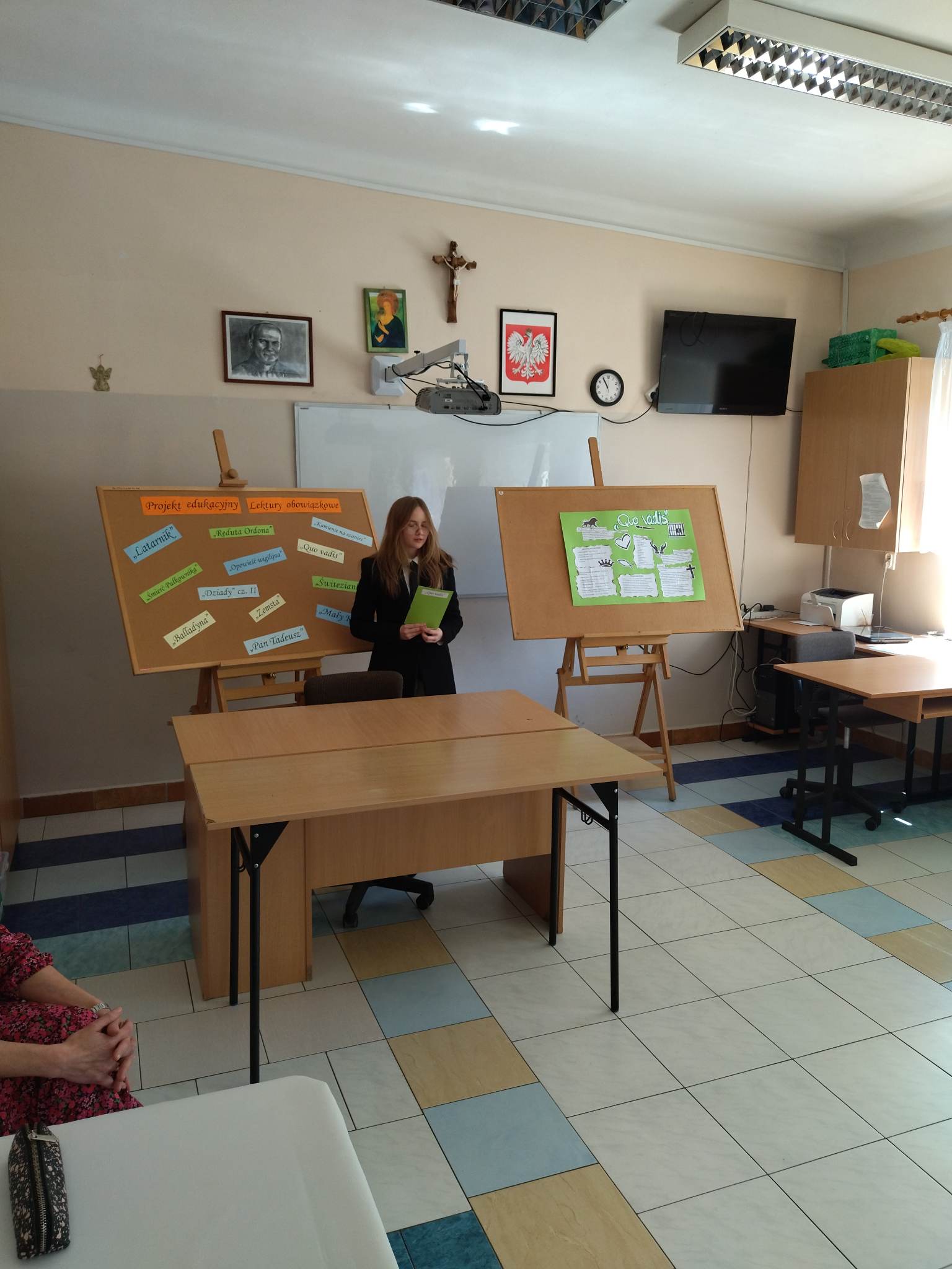 W ramach przygotowania do egzaminu ósmoklasisty uczniowie klasy ósmej zrealizowali w II semestrze projekt edukacyjny: „Lektury obowiązkowe”. W każdym tygodniu jeden z uczniów przypominał najważniejsze informacje dotyczące jednej z lektur, następnie wszyscy redagowali formy wypowiedzi, rozwiązywali krzyżówki, testy i wykonywali szereg innych zadań utrwalających wiedzę i doskonalących praktyczne umiejętności. Dzisiaj, na zakończenie projektu każdy z uczniów wcielił się w jednego z bohaterów.