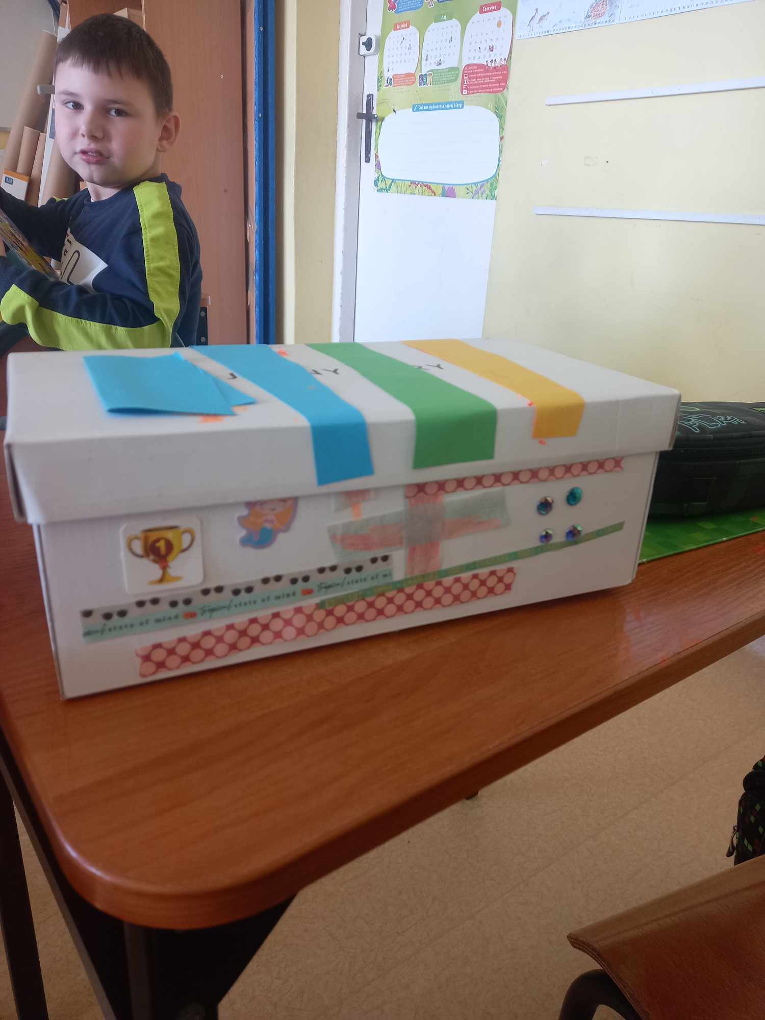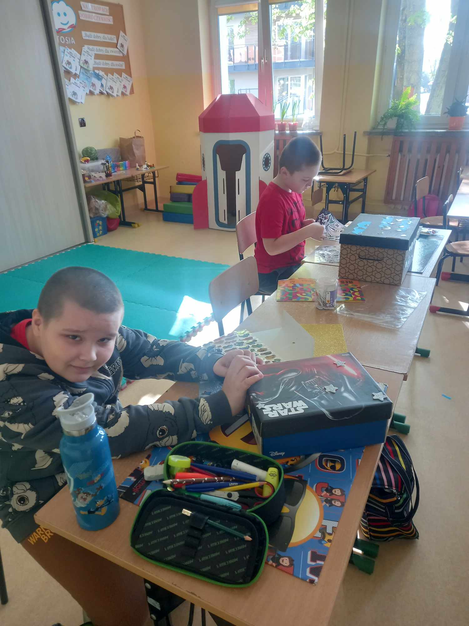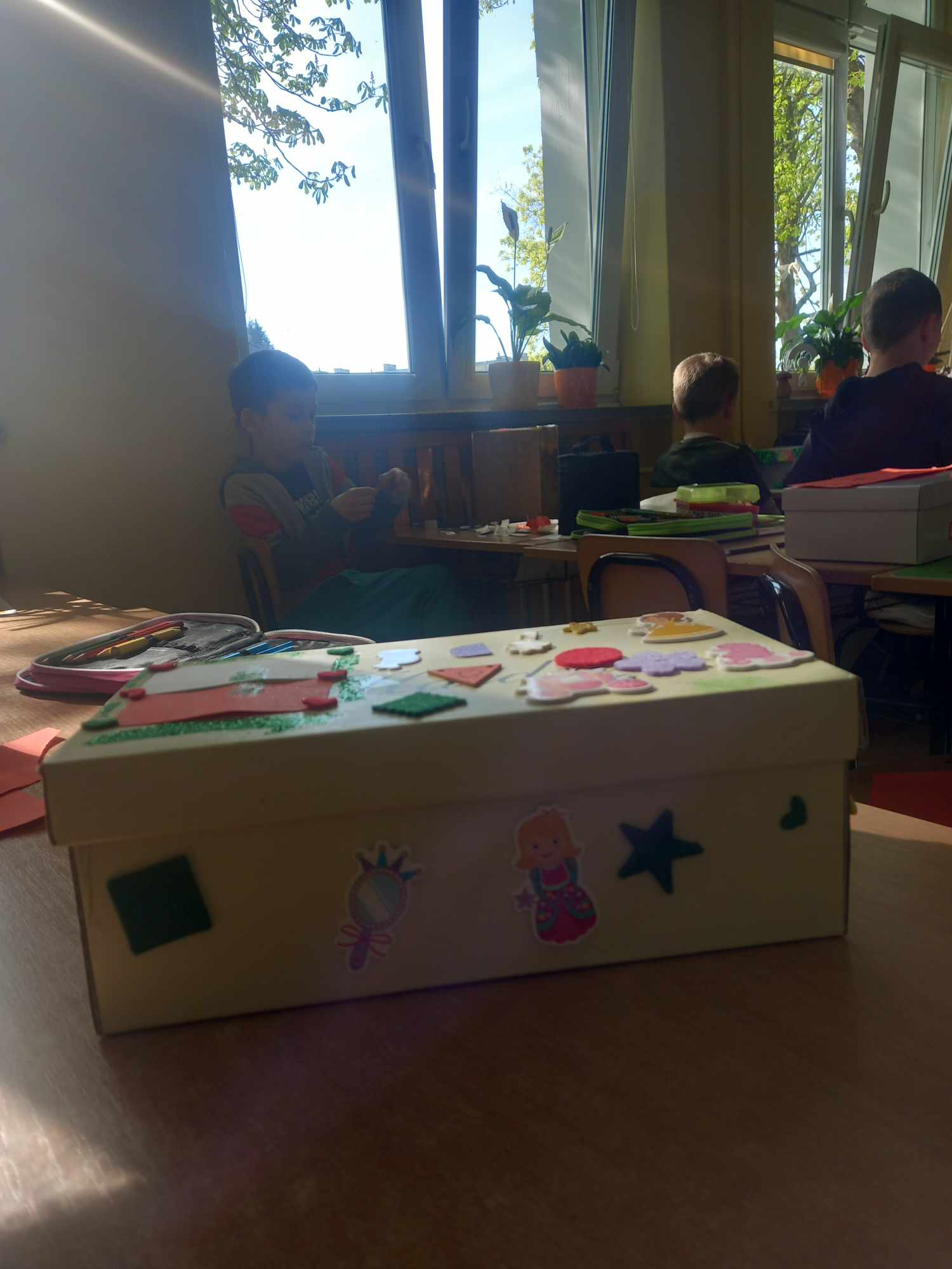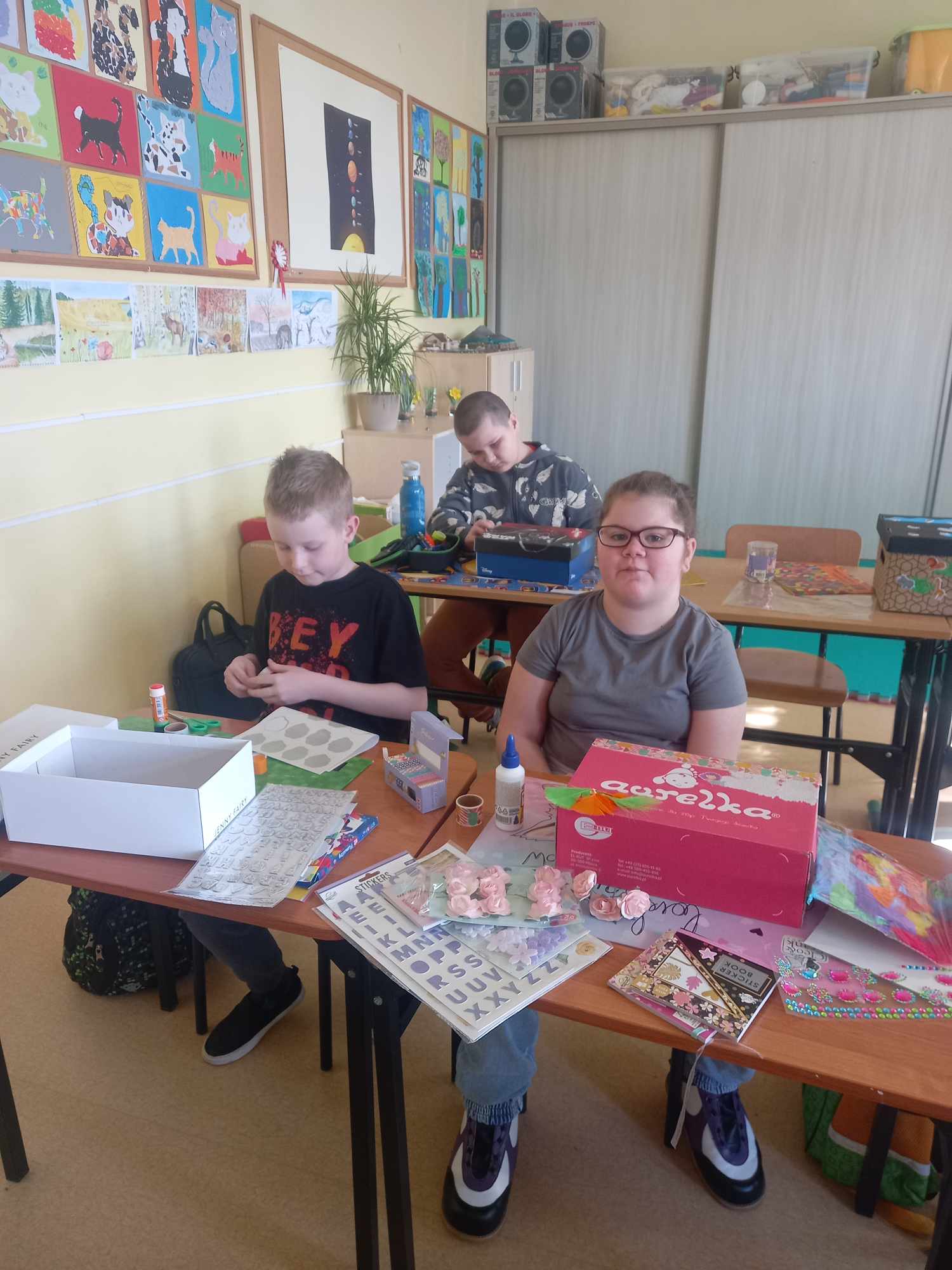 Na dzisiejszych zajęciach dzieci samodzielnie wykonywały swoją apteczkę skarbów, ozdabiały pudełka według swoich pomysłów, do których stopniowo będą wkładały rozmaite rzeczy, jakie będą im pomocne, by złagodzić stres, ból, przykrość czy zranienia emocjonalne oraz będą wzmacniały i utrwalały to, co w nich i w ich życiu jest skarbem.