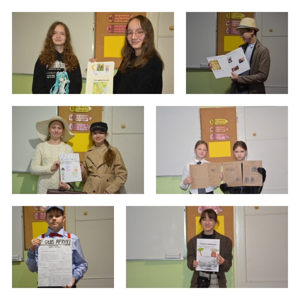 W związku z omawianiem lektury pt. „W pustyni i w puszczy” Henryka Sienkiewicza uczniowie klasy 6 wzięli udział w projekcie edukacyjnym pt. „Śladami Stasia i Nel”. W ramach realizacji zadań projektowych uczniowie wcielili się w bohaterów lektury i dziennikarzy, przygotowując specjalny numer gazety poświęcony przygodom bohaterów. Dodatkowymi elementami była kartka z pamiętnika Stasia oraz krzyżówki i rebusy związane z lekturą. Szóstoklasiści udowodnili, że uważnie i ze zrozumieniem przeczytali powieść Henryka Sienkiewicza, zdobyli wiele ciekawych informacji o faunie i florze oraz zwyczajach mieszkańców Czarnego Lądu.