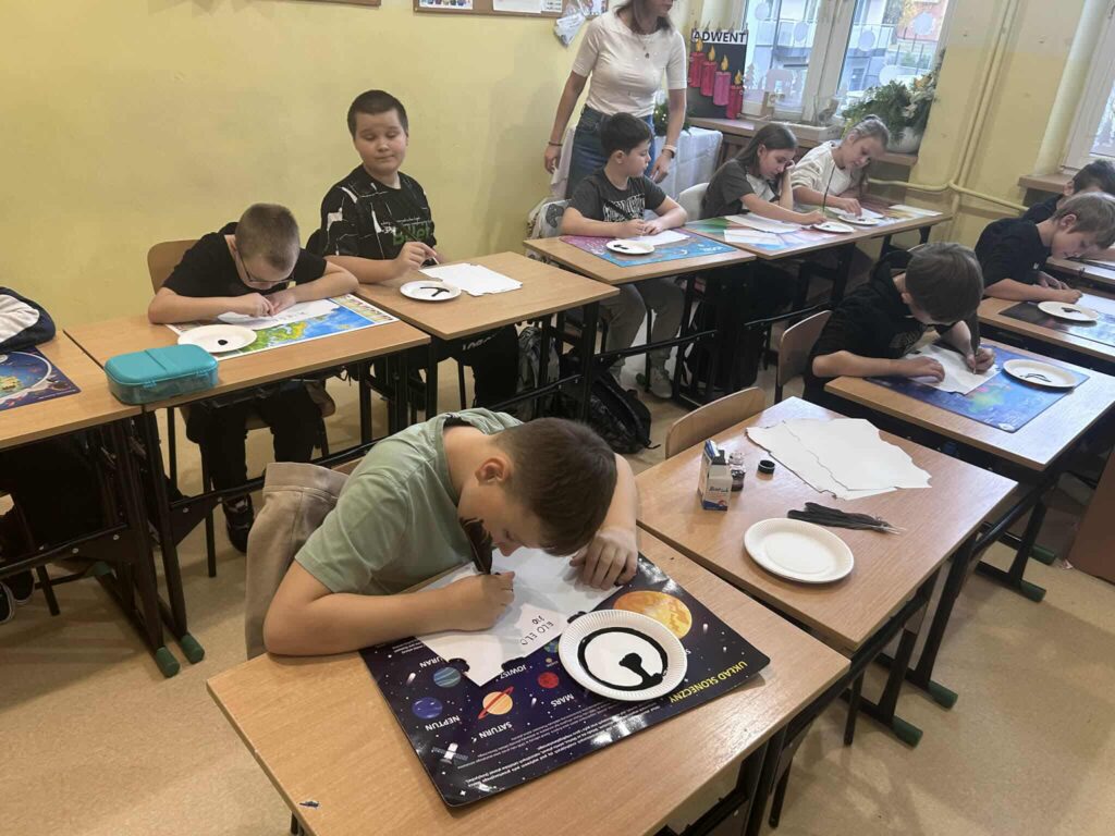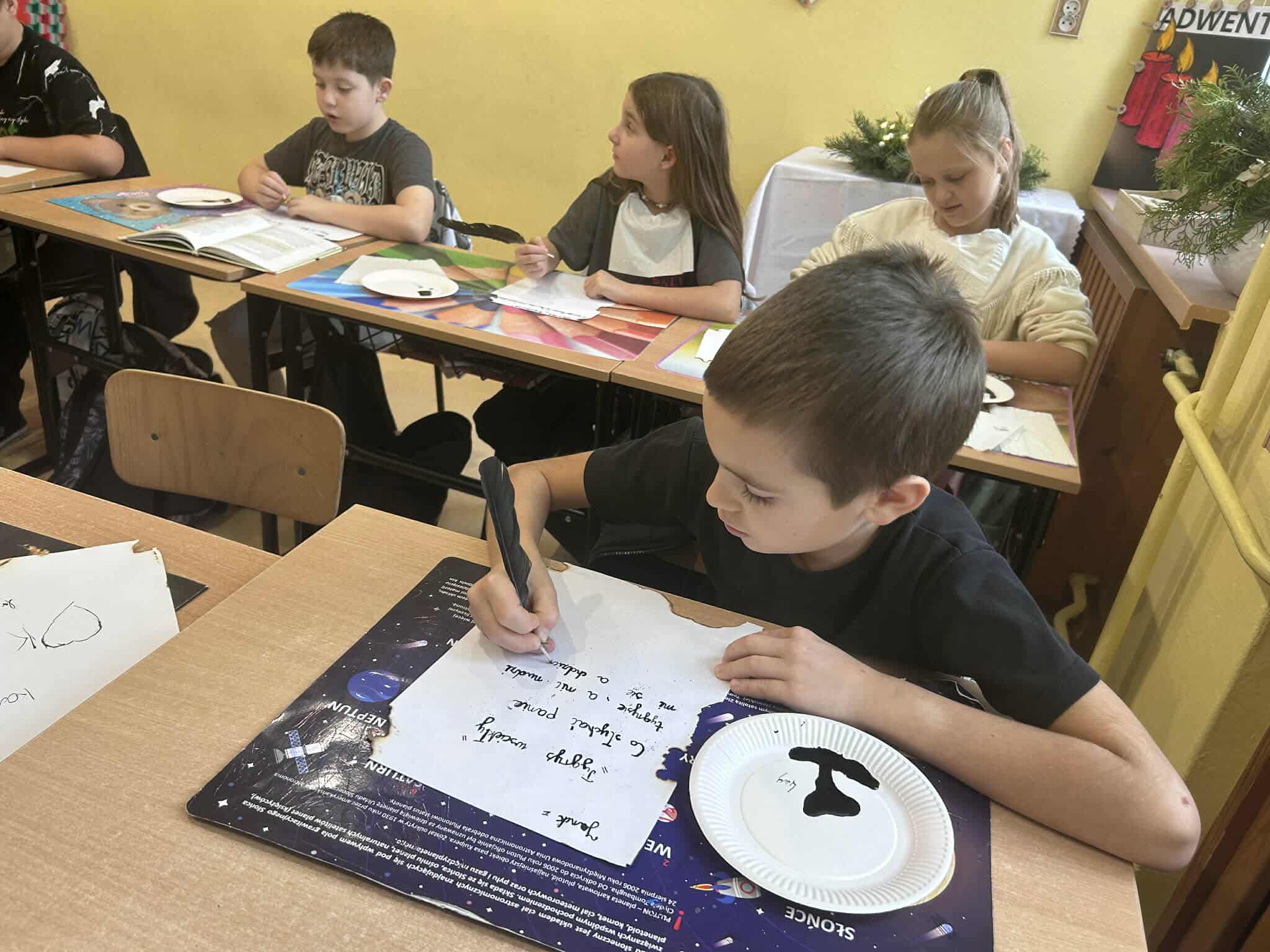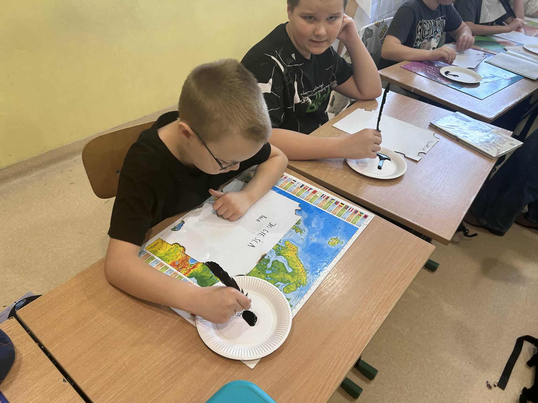 Uczniowie klasy 3 uczestniczyli w niezwykłych zajęciach, podczas których przenieśli się w czasie 📜. Odbyli podróż do czasów życia i twórczości poety Juliana Tuwima. Zainspirowani lekturą pt.,, Rany Julek! ‘’ dowiedzieli się, skąd brała się miłość Tuwima do słów, zabaw językowych i rymów. Liczne rozmowy o dzieciństwie poety, jego pasjach oraz o tym, jak codzienne obserwacje mogą przerodzić się w poezję. Zajęcia wzbogaciły także twórcze aktywności – uczniowie próbowali bawić się słowem, tworzyć własne rymy i neologizmy, naśladując styl Juliana Tuwima. Dzieci miały okazję spróbować pisania piórem gęsim maczanym w atramencie – tak, jak robiono to przed laty. Okazało się, że nie jest to wcale takie łatwe! Wymaga cierpliwości, skupienia i delikatności, ale daje ogromną satysfakcję i pozwala docenić piękno ręcznego pisma. Uczniowie tworzyli własne słowa, rymowanki i krótkie wierszyki, pełne humoru, dźwięków i wyobraźni. Nie zabrakło śmiechu, kreatywnych pomysłów i językowych eksperymentów, z których Tuwim słynął.