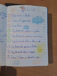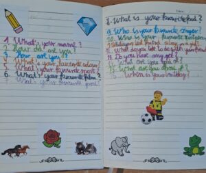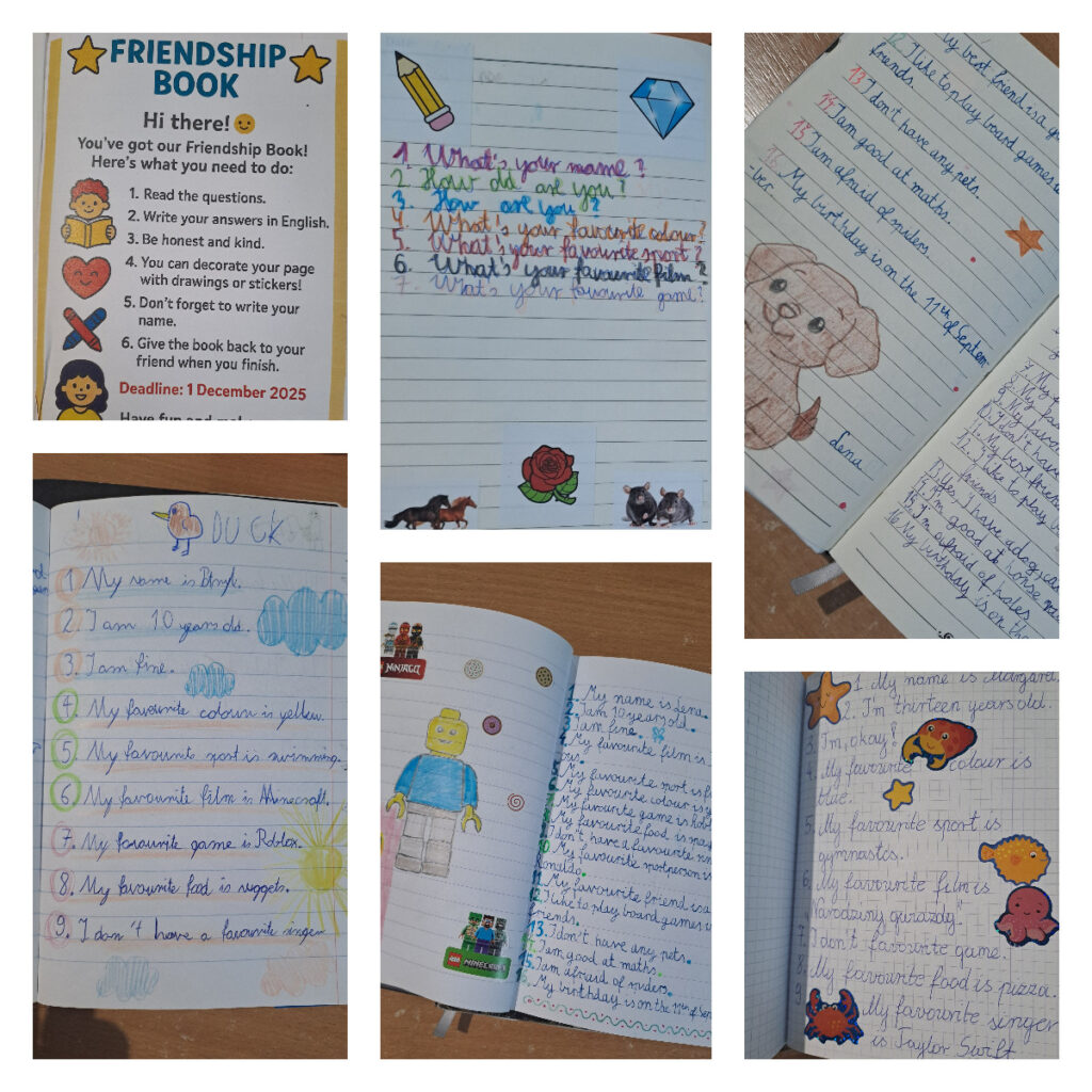 Na początku, podczas lekcji języka angielskiego, wspólnie wymyślaliśmy pytania, które chcieliśmy zadać innym. Następnie przez dwa tygodnie uczniowie wymieniali się swoimi friendship bookami, zbierając wpisy od kolegów, koleżanek, a nawet nauczycieli 👩‍🏫👨‍🏫
