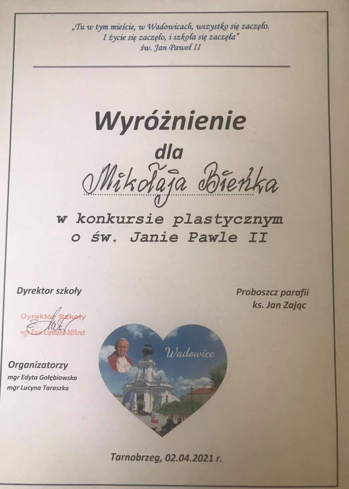 Uczniowie klas IV – VI wzięli udział w konkursie matematyczno- plastycznym, zadaniem uczniów było stworzenie pracy plastycznej, w której ukryta została grecka litera Ω.