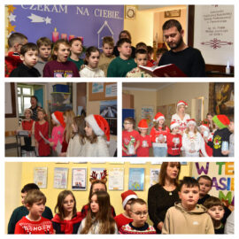 Następnie odbyło się wspólne kolędowanie, a klasa gimnazjalna zaśpiewała Cichą Noc w trzech językach : polskim, niemieckim i angielskim. Po wspólnym śpiewaniu kolęd klasa I i zerówka zaprezentowała swoje przedstawienie pt. „Kolędnicy”. Przedstawienie zbudziło wiele zachwytu i było bardzo udane, ale najbardziej podobał nas się trzyletni Czarek, który zaprezentował nam swoje nowe aktorskie i taneczne talenty.