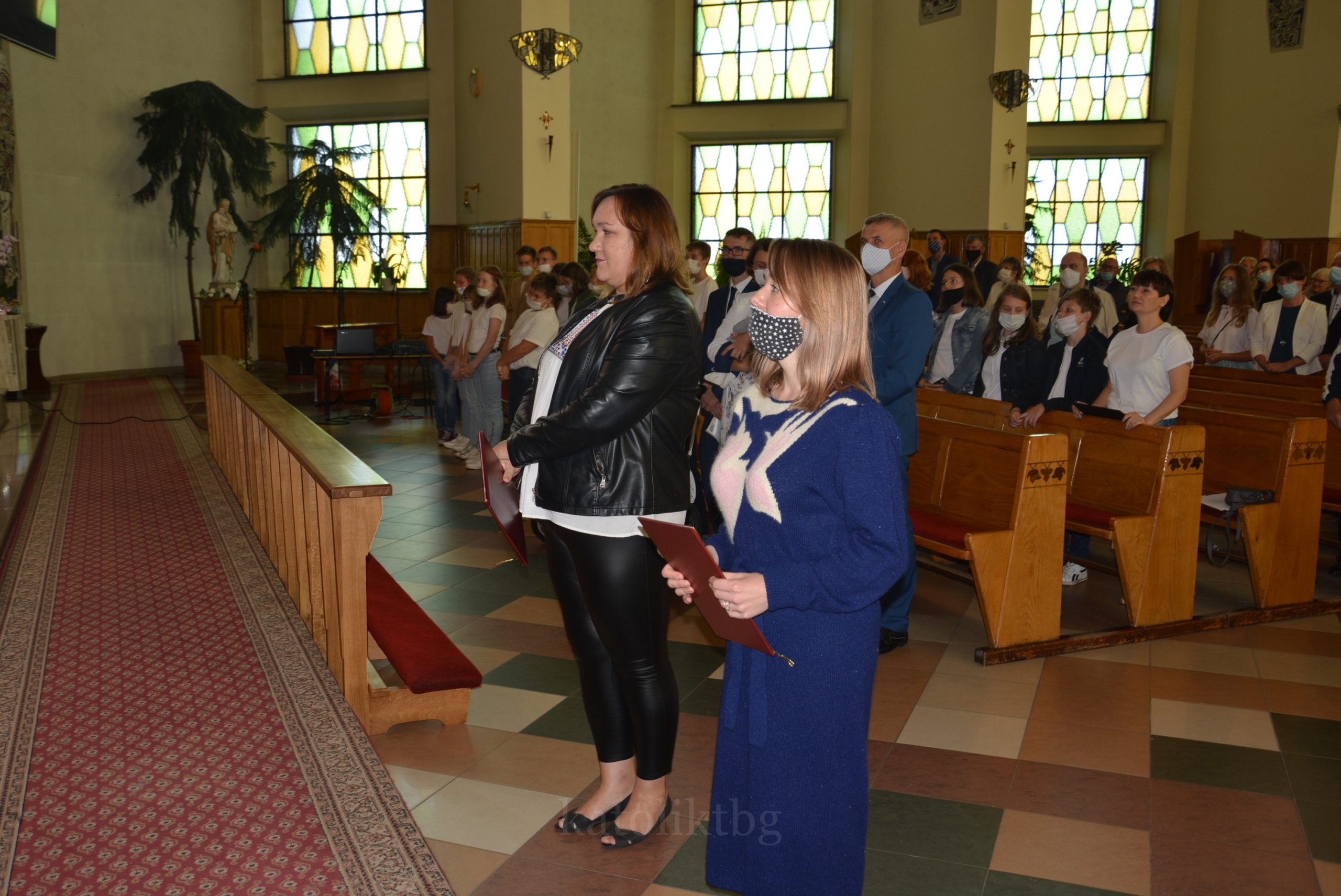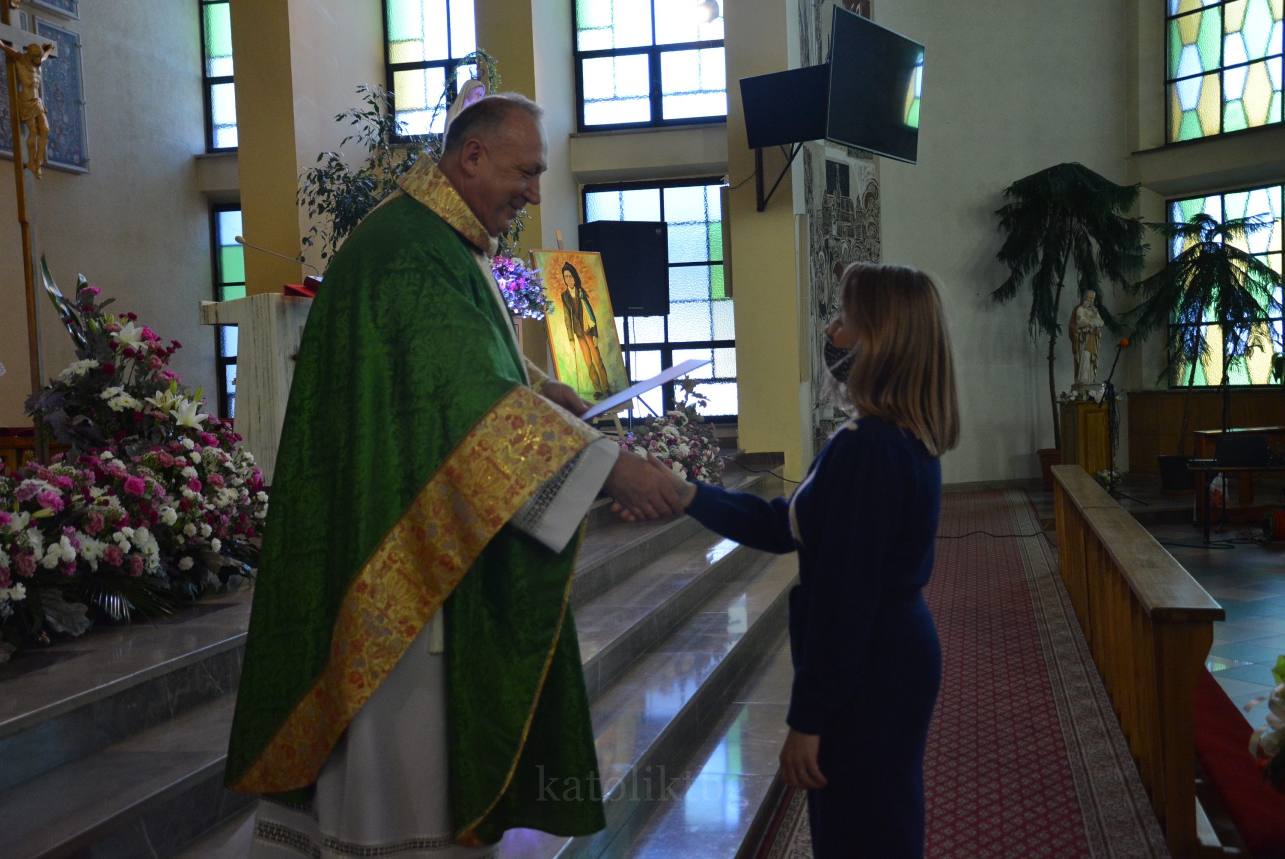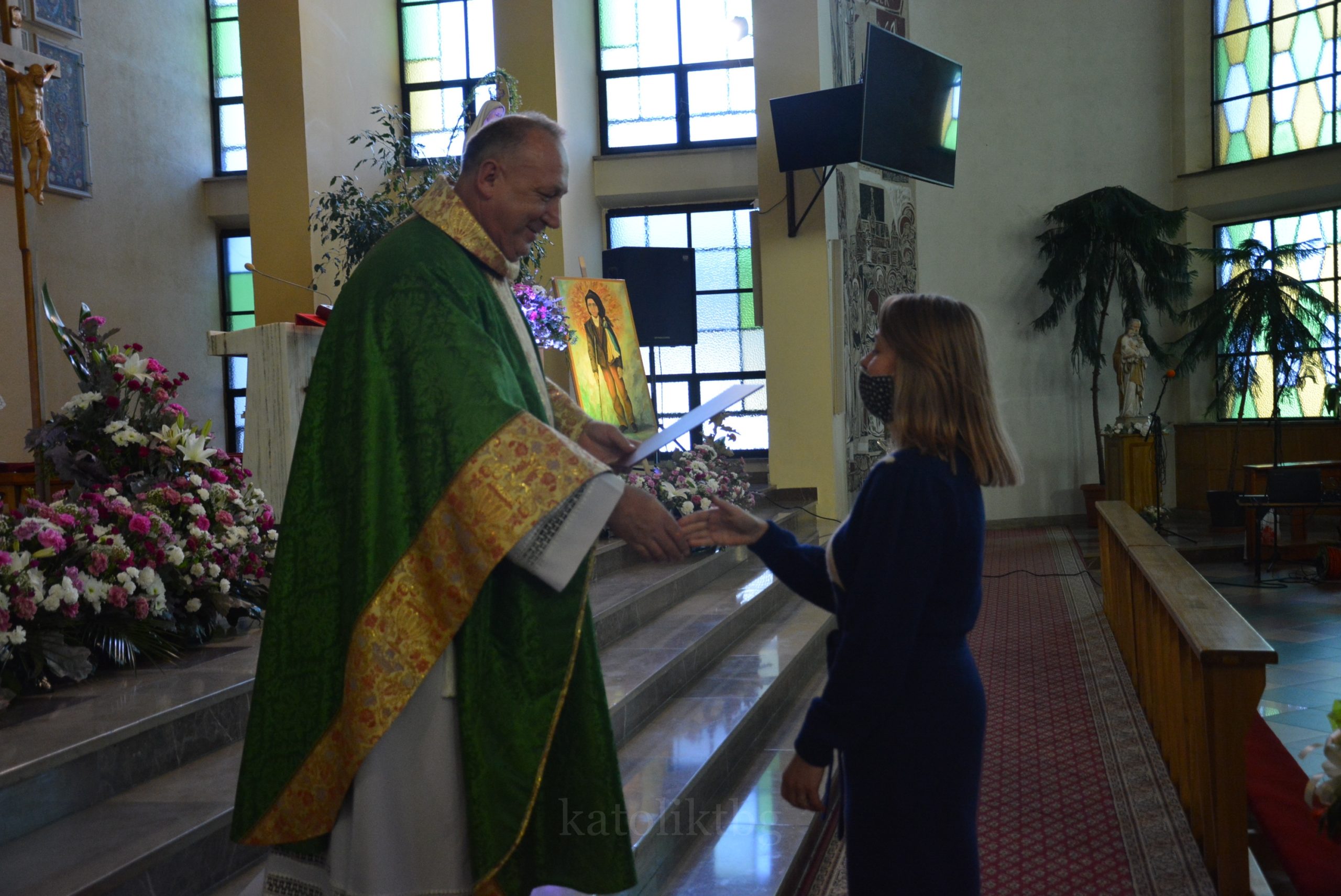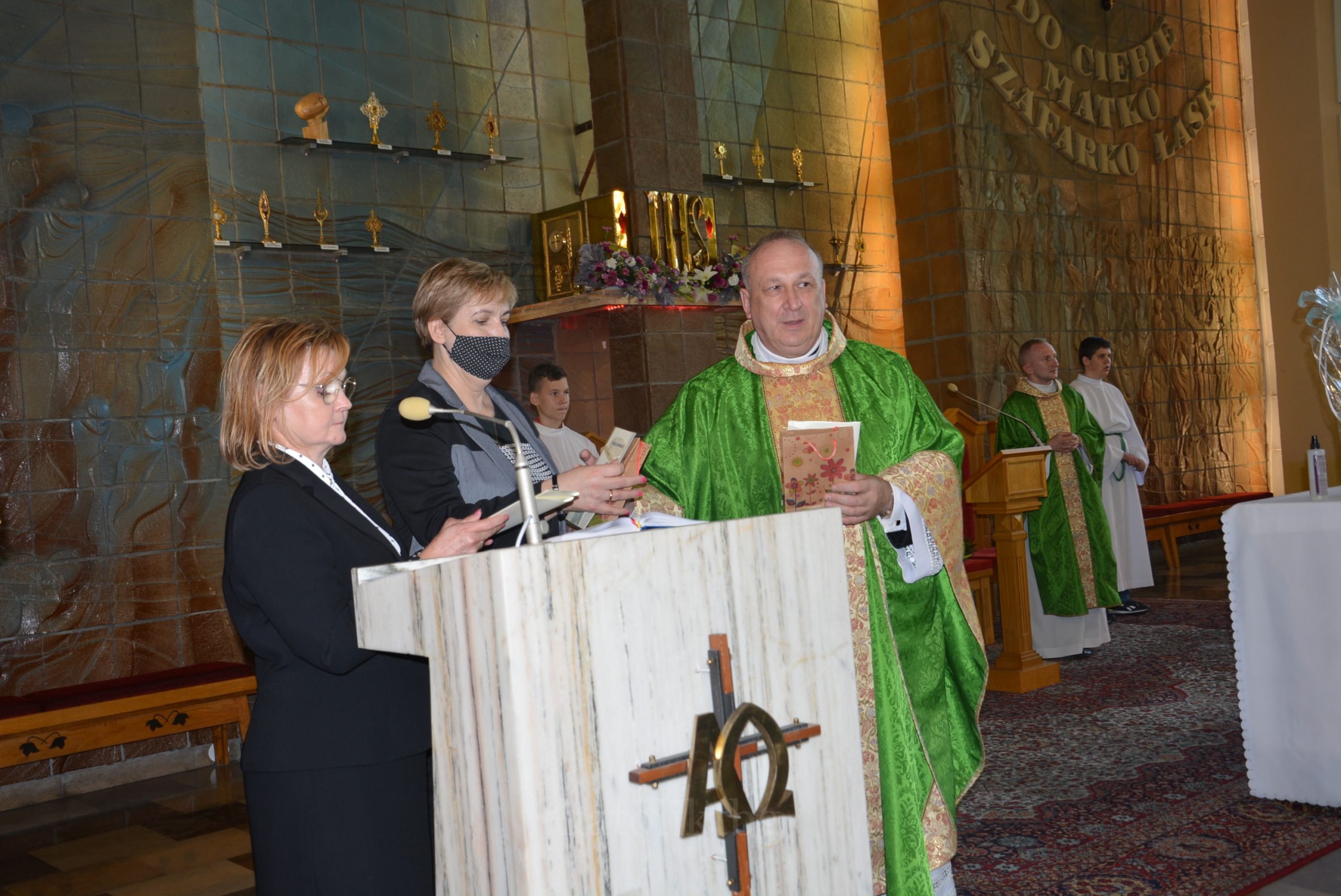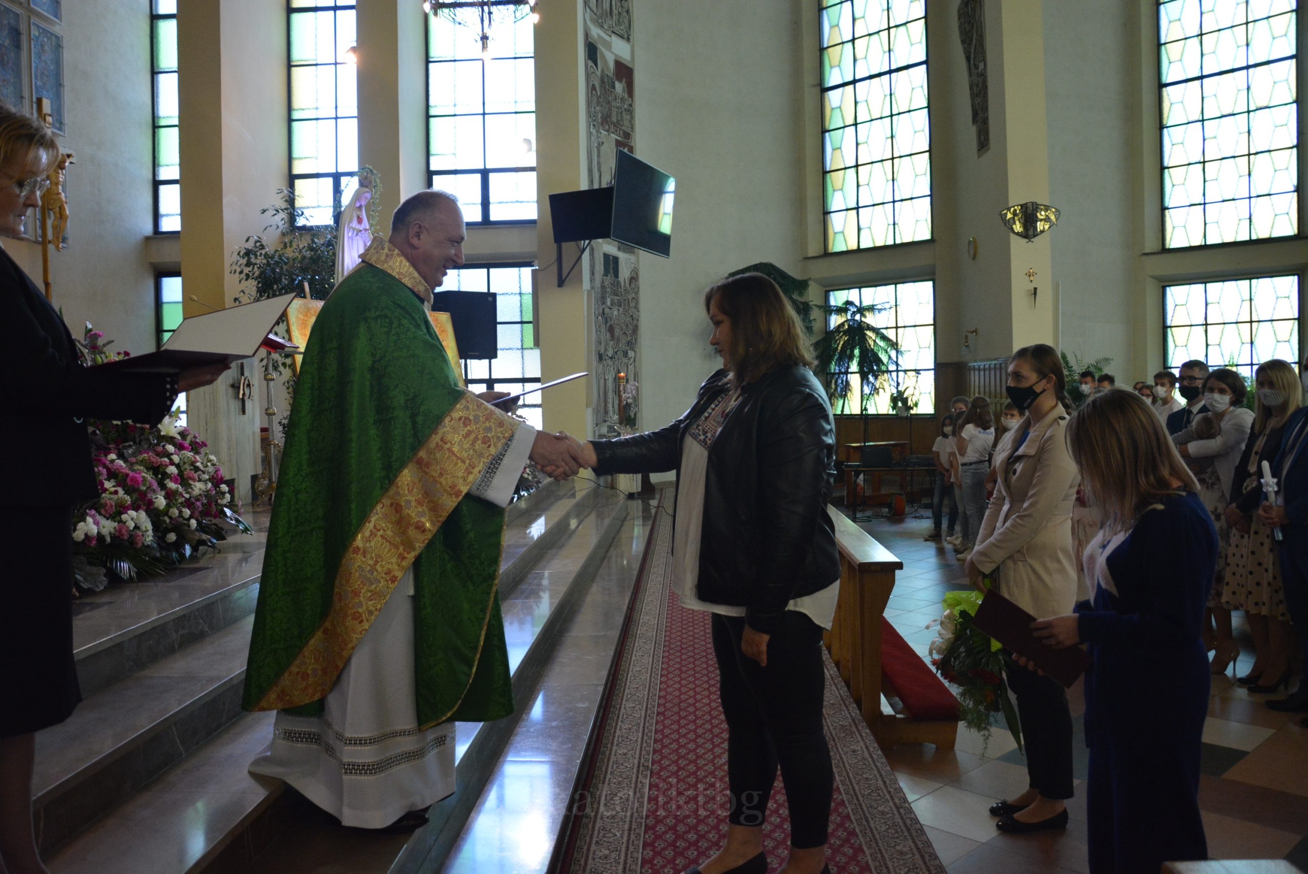Wszyscy zgromadzeni: ksiądz prałat, opiekun Szkół Katolickich w Tarnobrzegu oraz ich Dyrekcja, nauczyciele, uczniowie, rodzice, osoby zaprzyjaźnione mieli możliwość uczestniczyć w pięknej Mszy Świętej. Po niej nastąpiło uroczyste wręczenie Aktu Mianowania nauczycielom, którzy uzyskali ten stopień awansu zawodowego: p. Urszuli Łyko, p. Katarzynie Sałek, p. Barbarze Trzpis-Wiącek oraz księdzu Pawłowi Dobrowolskiemu. Następnie wręczono Podziękowania dla Rodziców szczególnie zaangażowanych w życie szkoły: Państwu Katarzynie i Grzegorzowi Krakowiakom, Państwu Elżbiecie i Wojciechowi Grodzkim, Państwu Małgorzacie i Krzysztofowi Lipińskim, Państwu Barbarze i Mariuszowi Żyłom oraz Państwu Alicji Wesołowskiej – Warzybok oraz Wojciechowi Warzybokowi.
