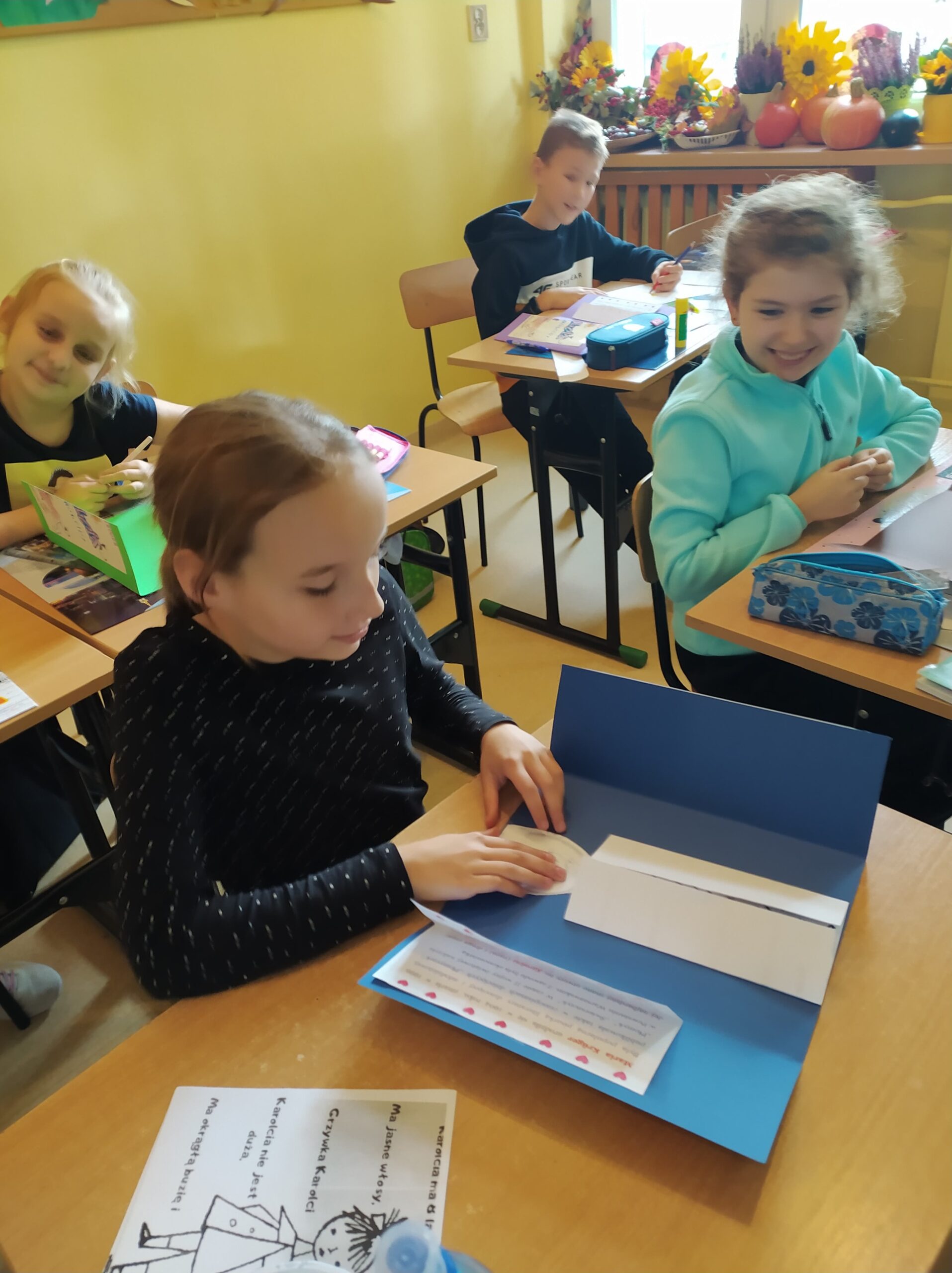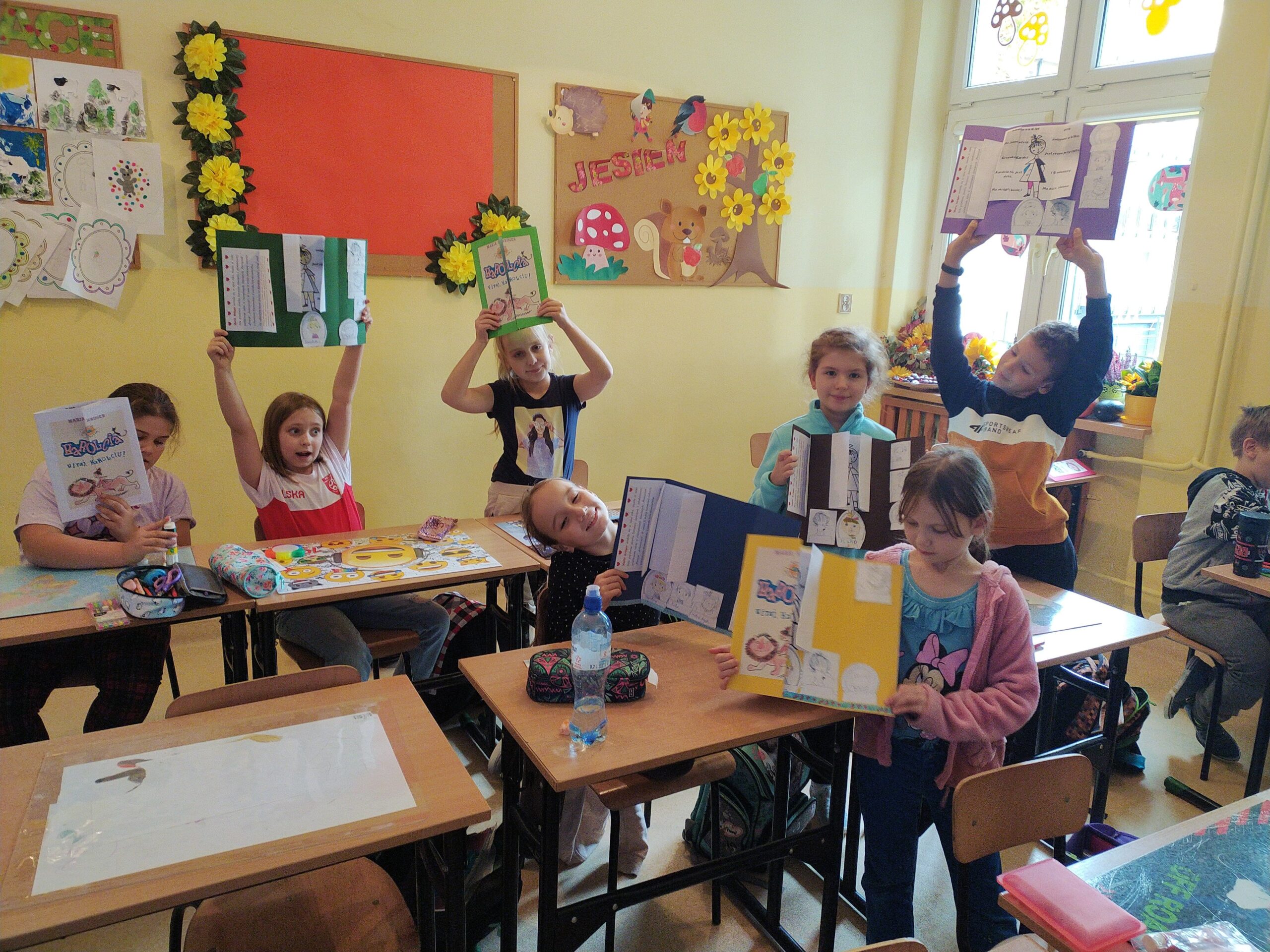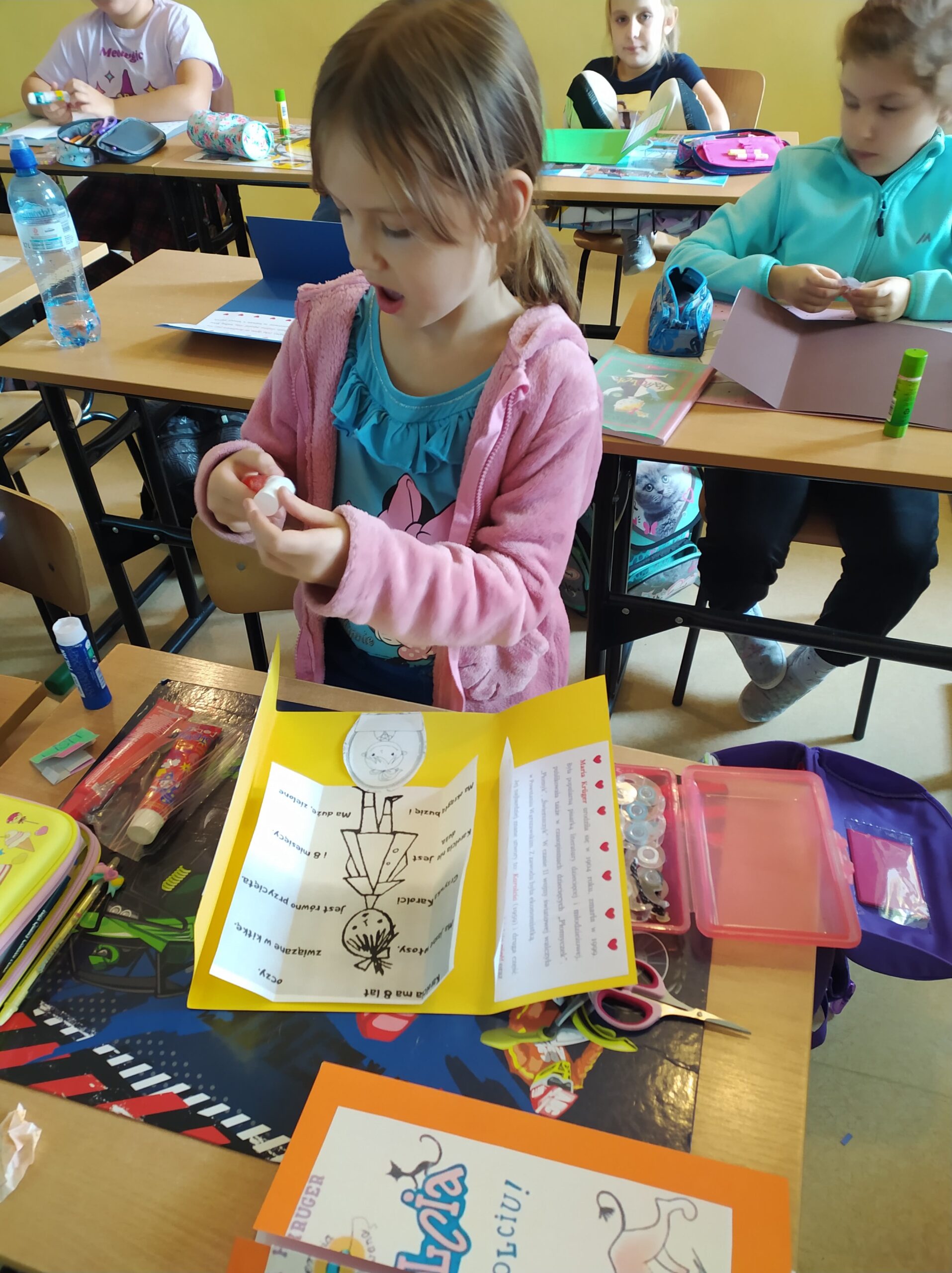 Zainspirowani uczniowie klasy 3 wykonali pracę twórczą, polegającą na stworzeniu Lapbooka. Dzieci zamieściły w nim najważniejsze, a zarazem najciekawsze informacje: notatkę o autorce, przedstawienie bohaterów, problematykę utworu, quizy związane z treścią książki oraz magiczny koralik.