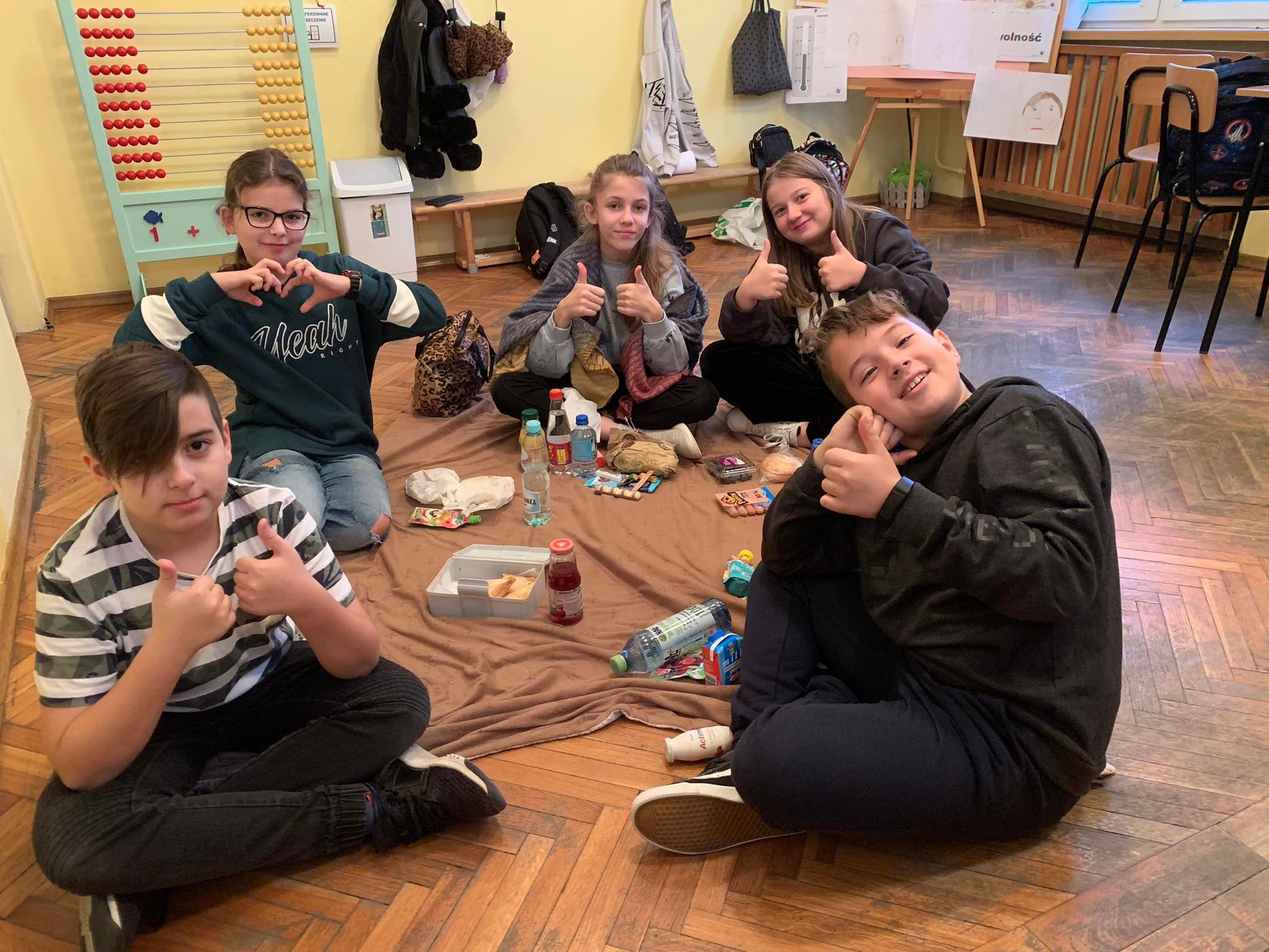 W ramach treningu zagadnienia gramatycznego z języka angielskiego jakim jest policzalność rzeczowników oraz określanie ilości, uczniowie klasy piątej zorganizowali śniadaniowy piknik, podczas, którego omawiali przygotowane produkty w języku obcym, podając ilość, formy pakowania oraz zadawając sobie pytania jako formę ćwiczeń leksykalno-gramatycznych. Piątkowy poranek minął pod hasłem Picnic Breakfast, dzięki czemu nikt już nie był głodny, za to zwarty i gotowy do dalszej nauki.