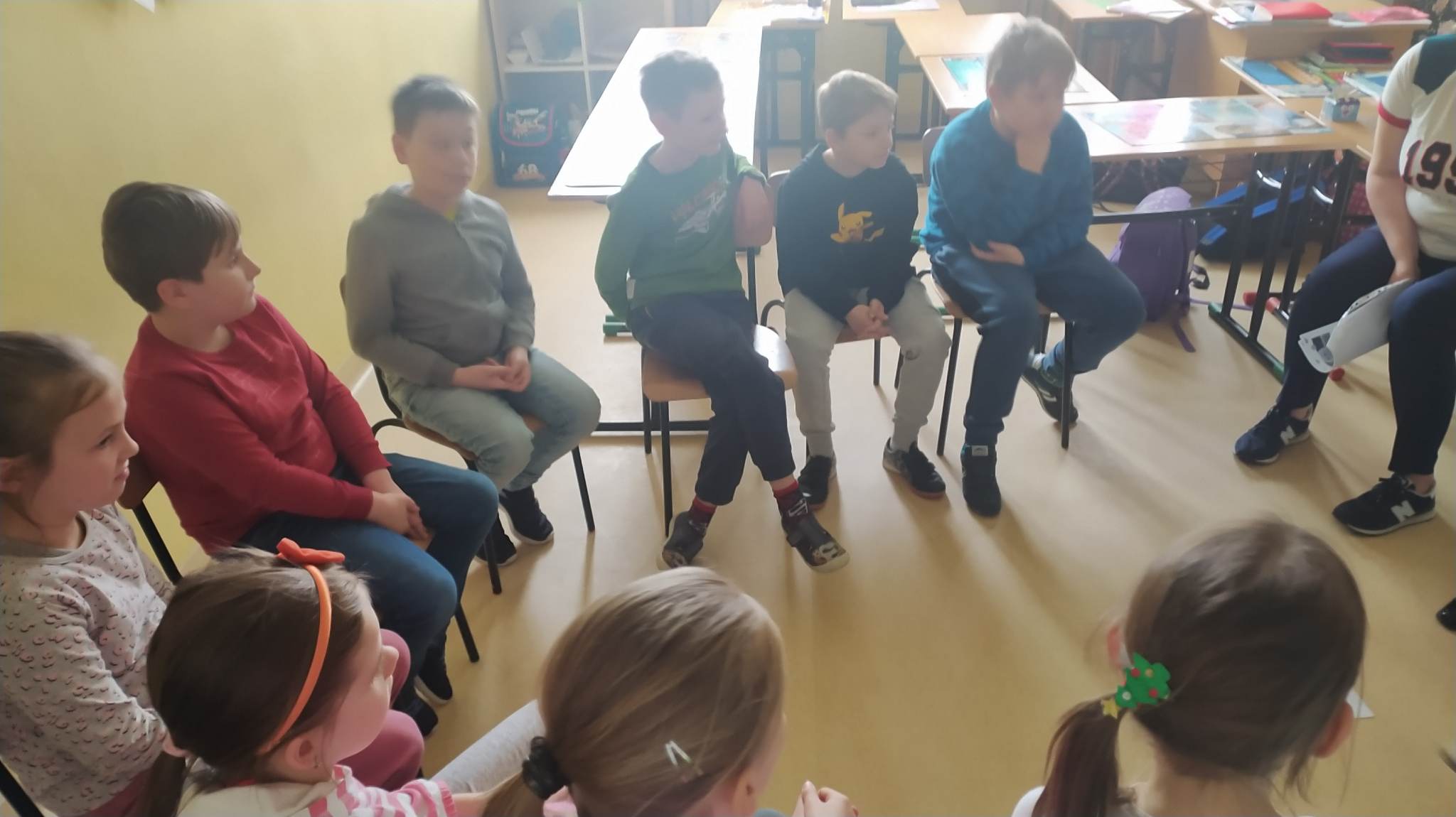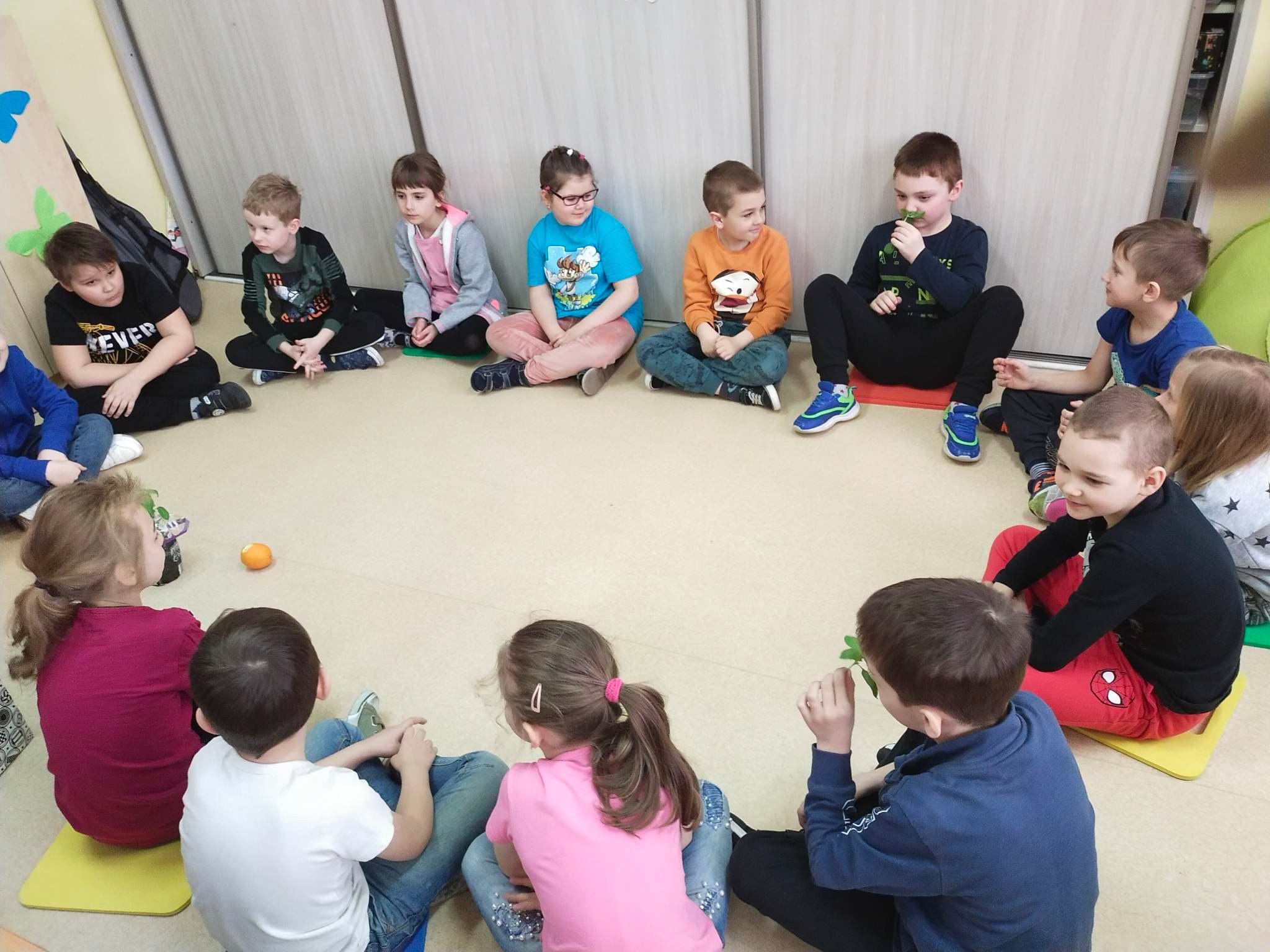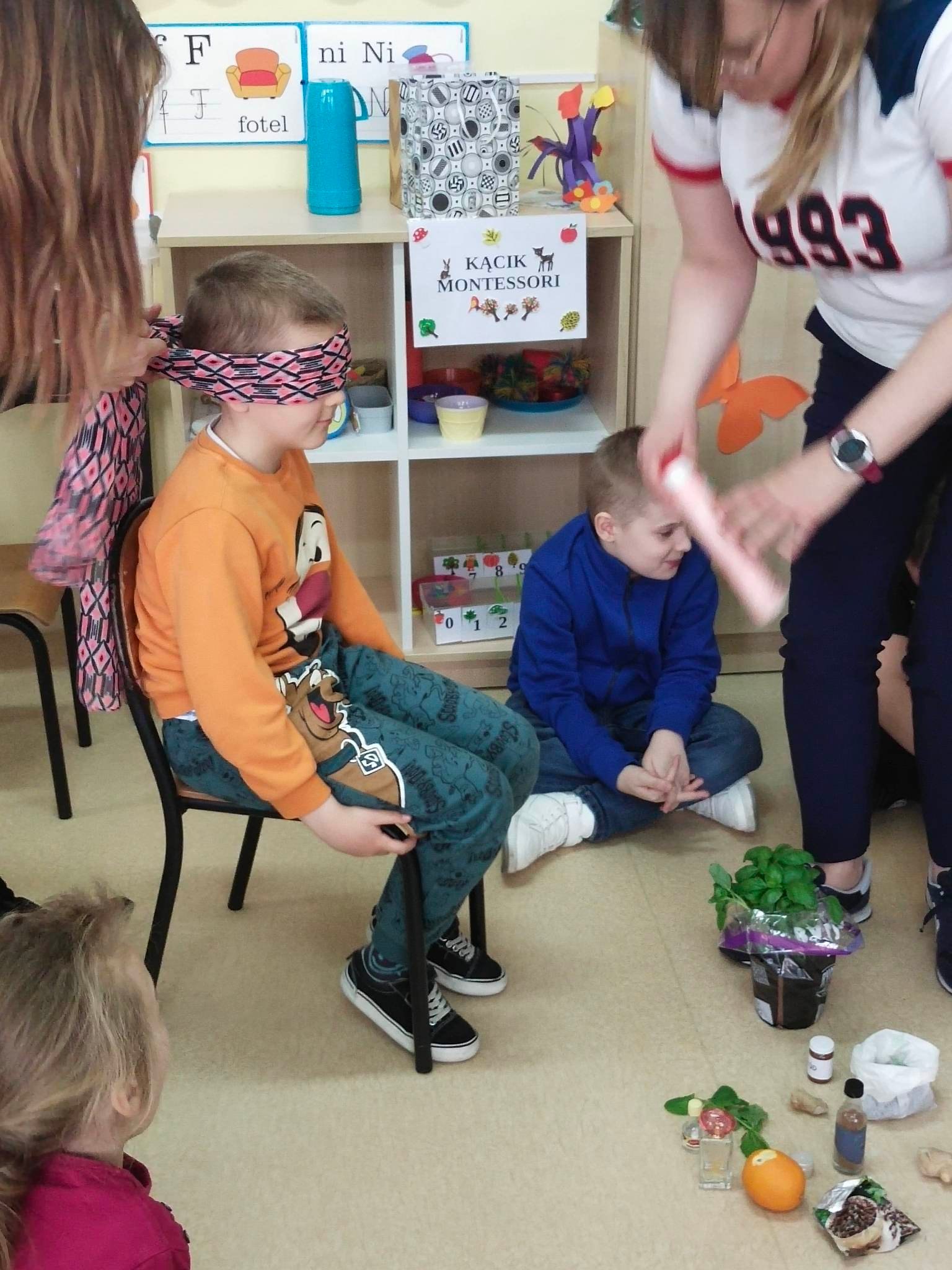 Zapoznały się z naturalnymi zapachami z otaczającego ich świata ( czekolady, mięty, mydła, cynamonu, perfum, kawy itp. ). Podczas rozmowy zastanawiały się czy zapachy im odpowiadają, z czym im się ko jarzą. Na koniec zajęć chętni uczniowie mieli możliwość zgadywać zapachy z zasłoniętymi oczami.