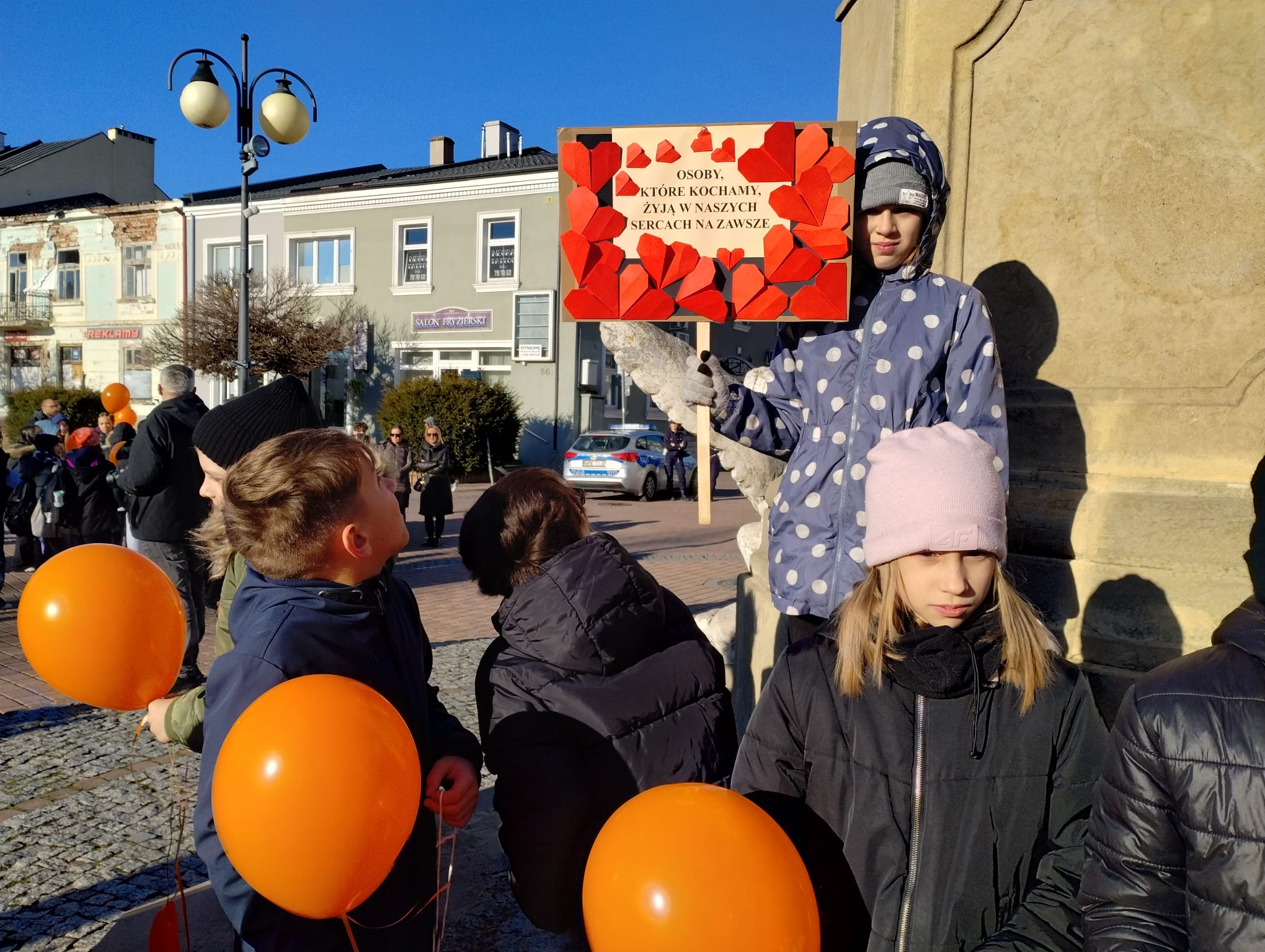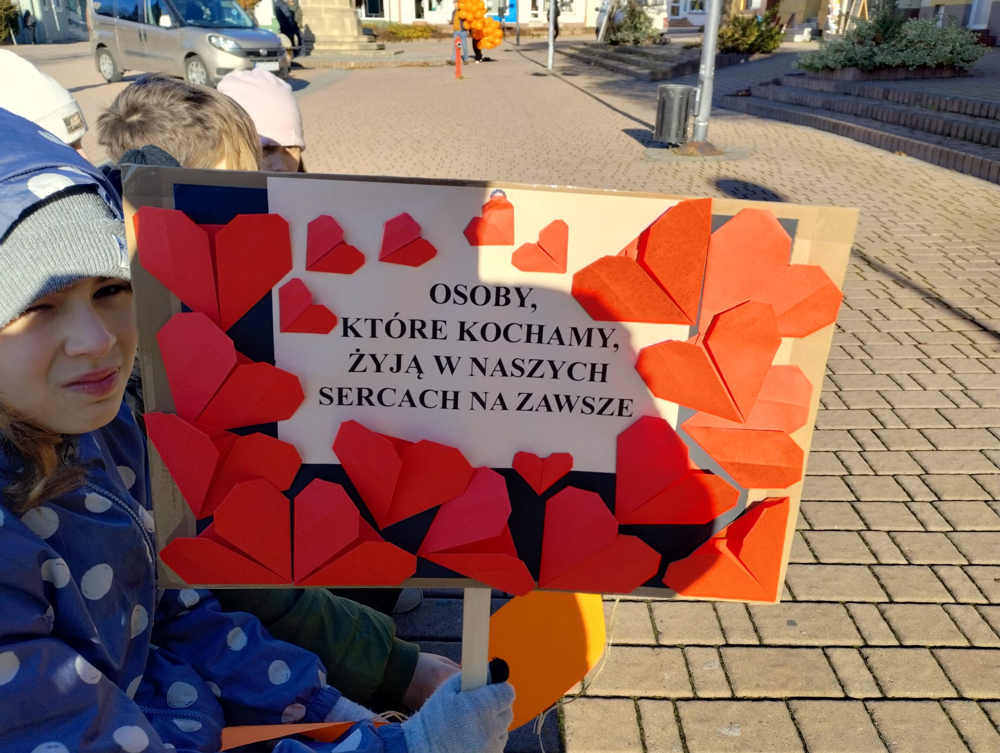 Po zakończeniu części konferencyjnej wszyscy uczestnicy wyruszyli w Marszu Pamięci „Kroki Wsparcia”. To właśnie w tej części wydarzenia klasa 4 zaprezentowała swoje pięknie przygotowane transparenty i papierowe serca ❤️🧡. Jedno z nich – „Osoby, które kochamy, żyją w naszych sercach na zawsze” – wzruszało swoją szczerością i prostotą 💞.