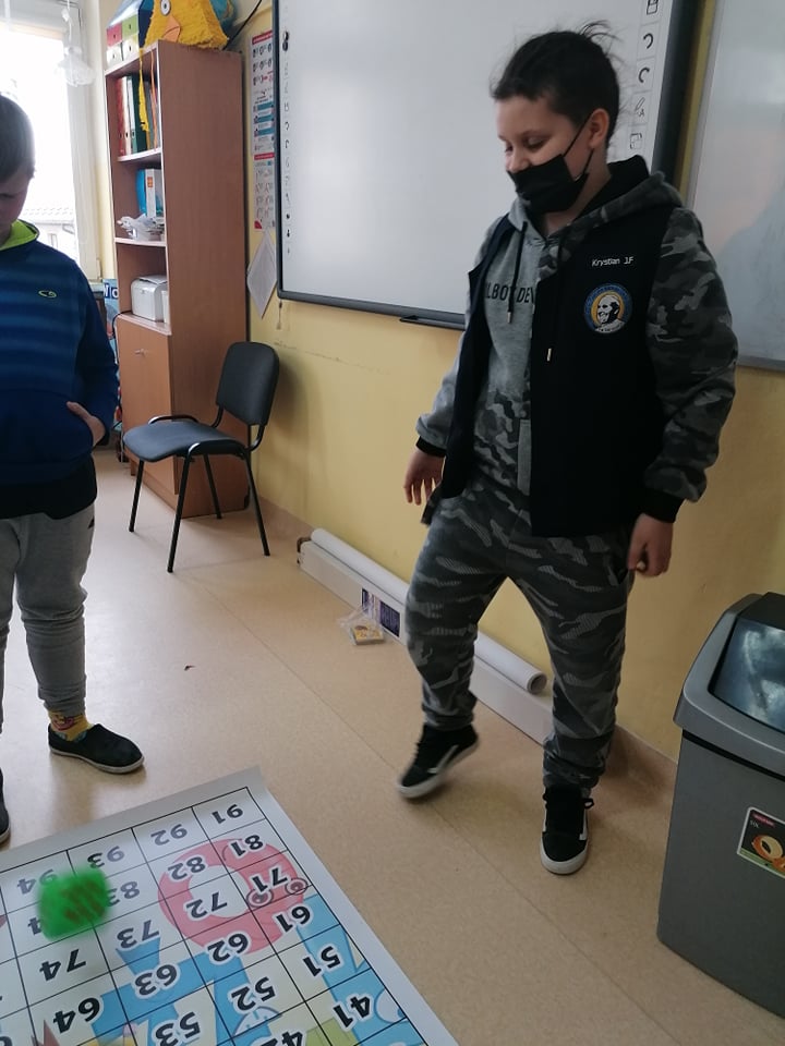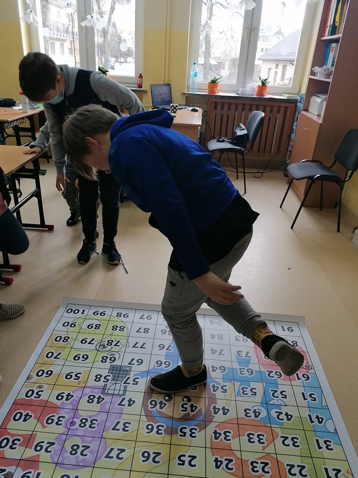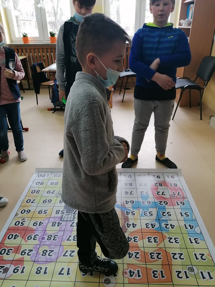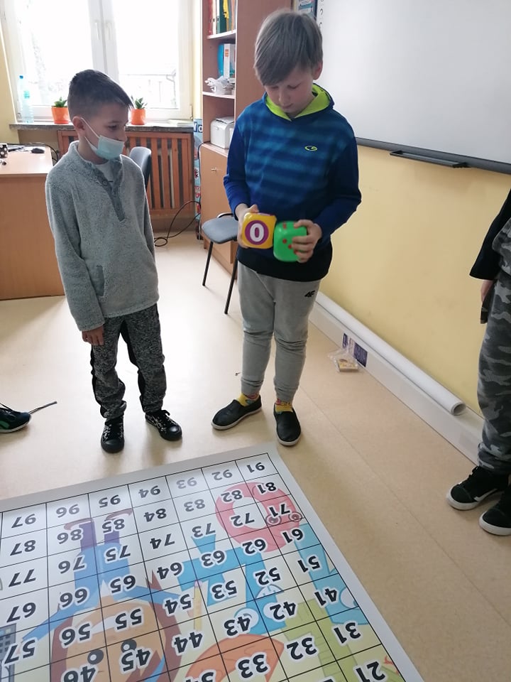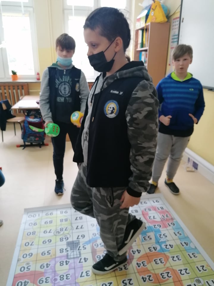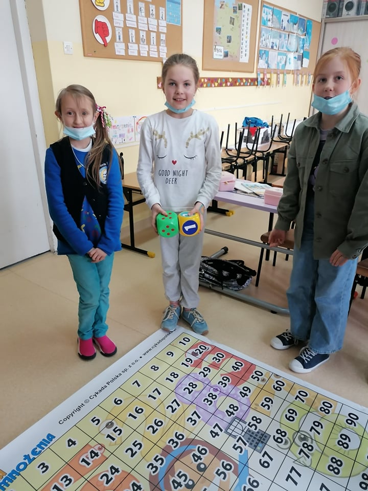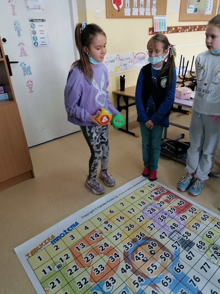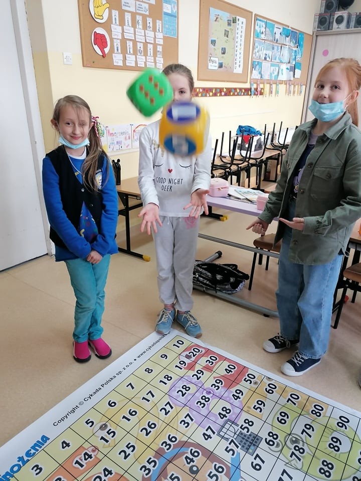 A to wszystko za sprawą prowadzenia przez nauczycieli jednej z najskuteczniejszych metod uczenia się, jaka jest nauka przez zabawę. Uczniowie klasy III umiejętność mnożenia utrwalili w niezwykły i ciekawy sposób, wykorzystując w tym celu matę edukacyjną. Dzieci rzucały wielkimi kostkami do gry, samodzielnie obliczając utworzone działanie z wyrzuconych oczek oraz odszukiwały odpowiedni liczbę z wynikiem na macie. Ćwiczyli w ten sposób nie tylko ważną umiejętność matematyczną, ale także koordynację ruchową, ponieważ przez kilka sekund musieli utrzymać się stojąc na jednej nodze na polu z wynikiem, co nie dla wszystkich okazało się łatwą sprawą