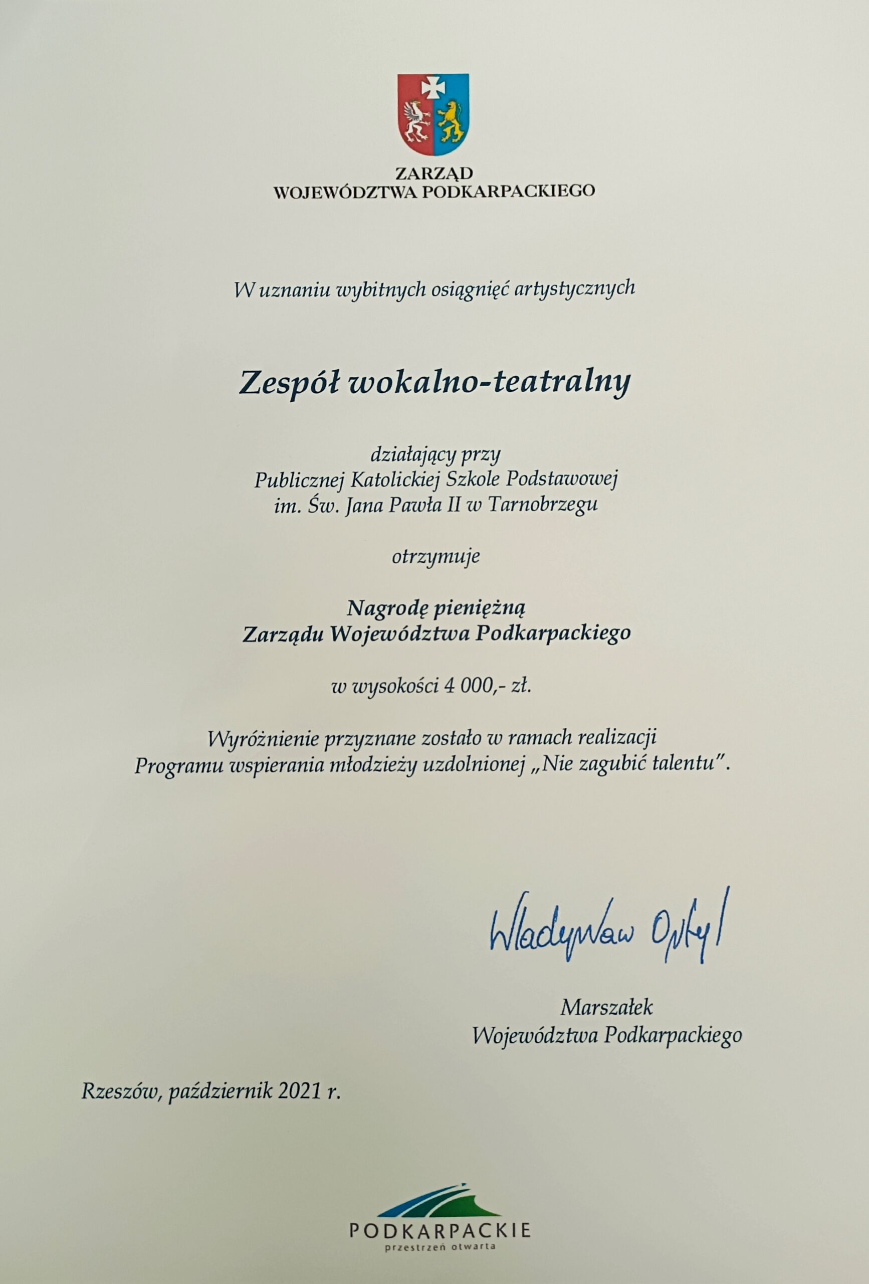 Miło nam poinformować, że Zespół wokalno – teatralny działający przy Publicznej Katolickiej Szkole Podstawowej im. św. Jana Pawła II w Tarnobrzegu otrzymał nagrodę pieniężną w wysokości 4 000 złotych. Wyróżnienie zostało przyznane przez Marszałka Województwa Podkarpackiego w ramach realizacji Programu wspierania młodzieży uzdolnionej pod hasłem „Nie zagubić talentu”, którego celem jest rozwój uzdolnień i zainteresowań uczniów szkół województwa podkarpackiego.