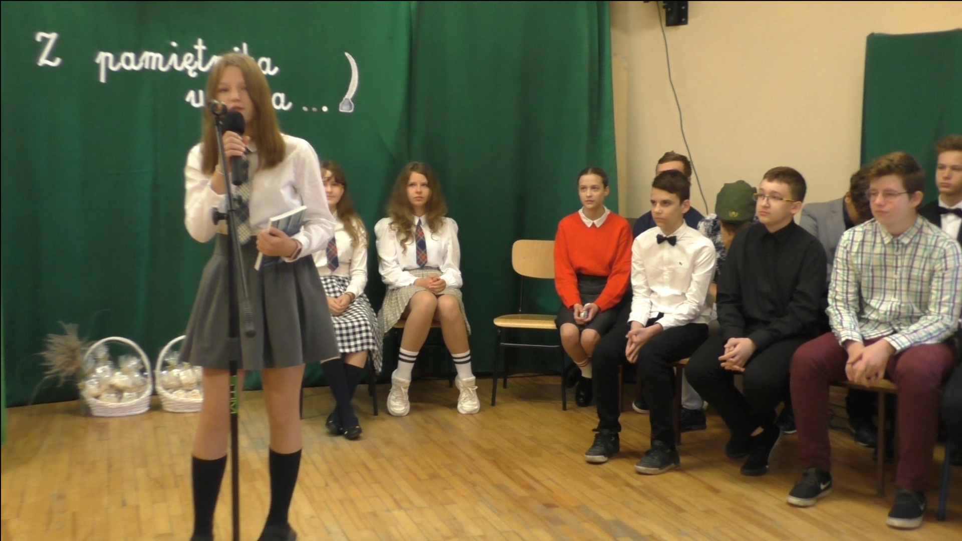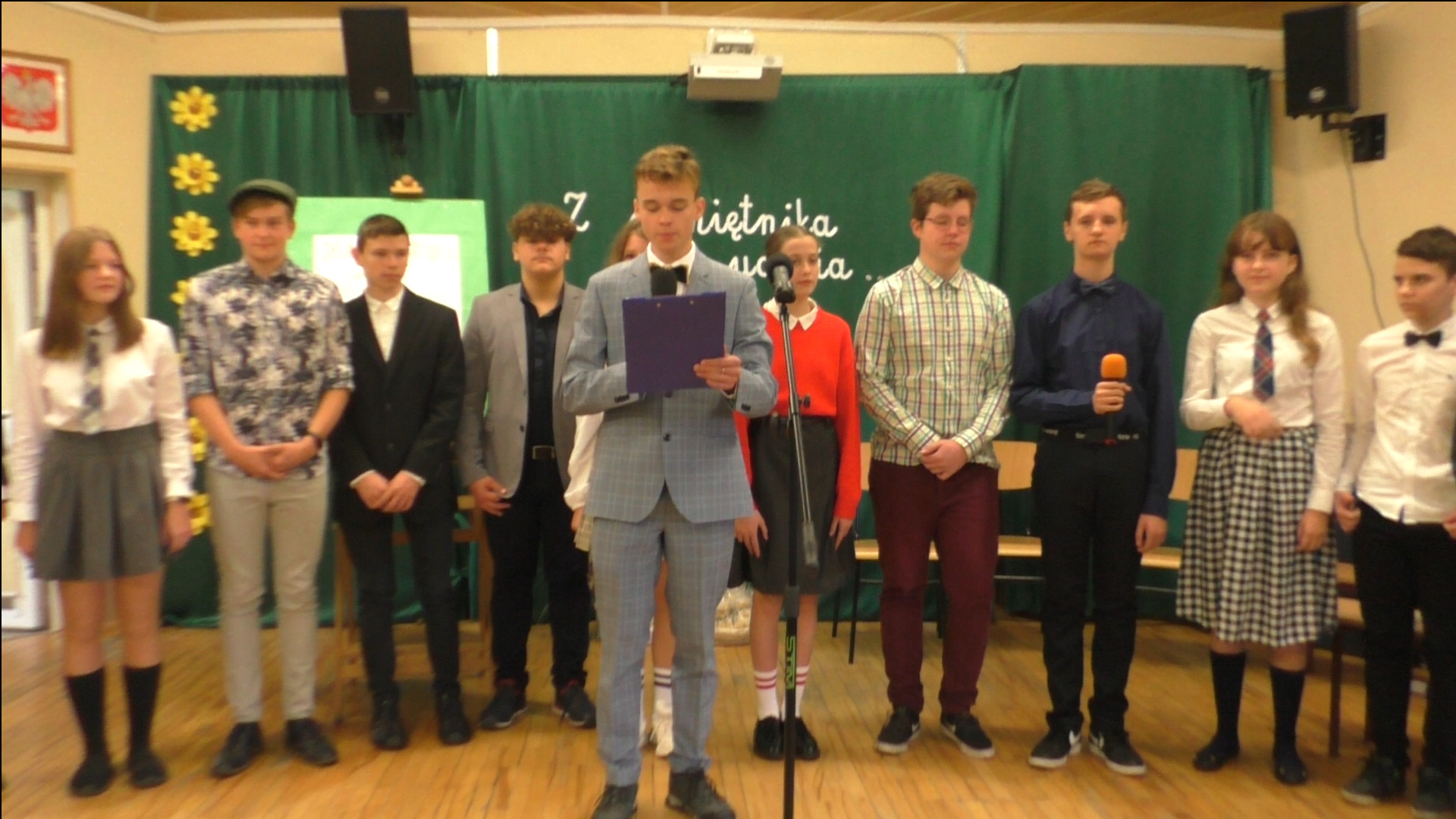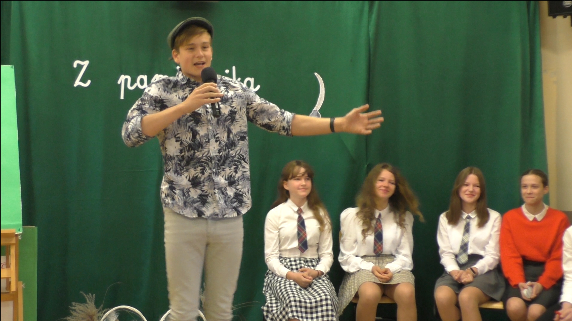 Punktem wyjścia programu artystycznego pod tytułem „Z pamiętnika ucznia…” była teza, że nauczyciele tak naprawdę nie wiedzą, co uczniowie czują, z czym się mierzą, że tyle w ich sercach zapytań oraz wątpliwości. Jak skrupulatnie zawiadomili Antonina Sałata oraz Maciej Karbowniczek, to, że uczniowie nie zawsze są należycie przygotowani do lekcji nie wynika z ich lenistwa czy zamiłowania do kombinowania, ale z wewnętrznego zagubienia lub po prostu z powodu… randki! Powstało studium najciekawszych przypadków. Materiał śpiewająco przedstawili: Anna Szozda – z języka angielskiego, Weronika Nowak – z matematyki oraz Krystian Nowak – z chemii i fizyki (istnieje duże prawdopodobieństwo, że zostaną zapytani w pierwszej kolejności ;-)). Przy czym na uwagę zasługuje również przypadek Gabrieli Wiącek, zagubionej w meandrach języka ojczystego oraz przypadek Filipa Marka, który tak dzielnie walczył z awarią mikrofonu podczas nauki zdalnej. Notabene, jakie to krzepiące, że Filip mógł liczyć na kolegów: Maciej Ordon oraz Maciej Karbowniczek zawsze ruszali z odsieczą. Przedstawiony program to tak naprawdę prośba o zrozumienie trudnego losu ucznia. W tym celu zaproszono również ekspertów: Pawła Sagana oraz Piotra Siudaka, którzy przedstawili krótkie wykłady. Należy wspomnieć, że prelekcjom towarzyszyły prezentacje plastyczne: „Nauczyciel-przewodnik” oraz „Uczeń-opornik” autorstwa klasowej artystki, Antoniny Sałaty (w przygotowaniach niezbędnych rekwizytów pomagały również Ania, Weronika oraz Gabrysia). Jak podsumował program główny reporter Kacper Gil: „Tak wygląda prawda o uczniowskim życiu”.
