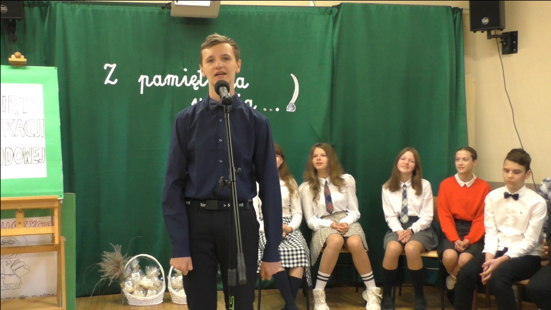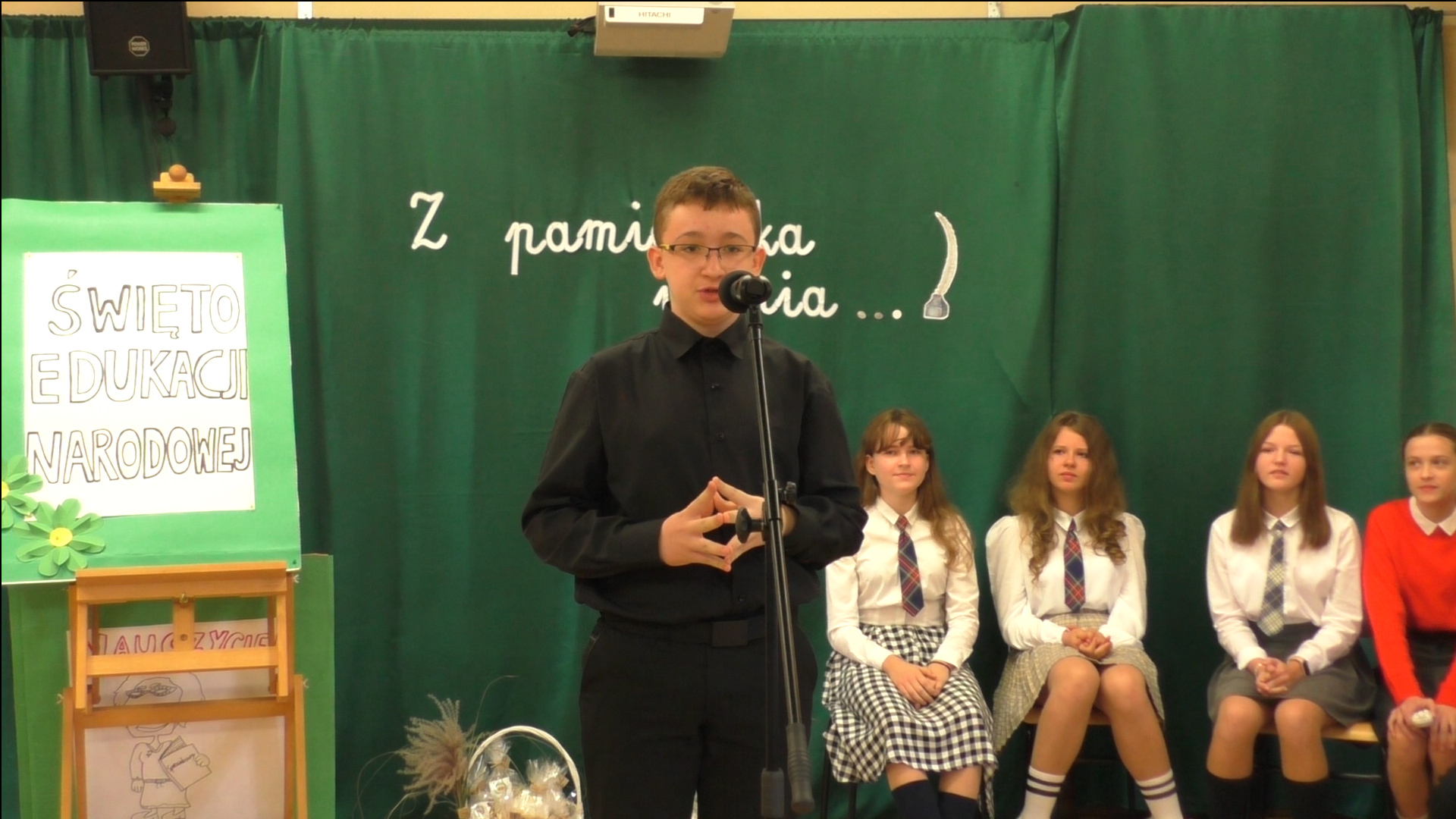 Z okazji Święta Edukacji Narodowej klasa ósma wystąpiła w brawurowym, szytym na miarę przedstawieniu według pomysłu p. Moniki Bieniek. Należy podkreślić, że wychowawczyni klasy, p. Maria Chartlińska-Markiel jeszcze tego samego dnia zdementowała pogłoski, jakoby uczniowie jej klasy kiedykolwiek wykorzystywali swoje aktorskie talenty na lekcjach 😉 .